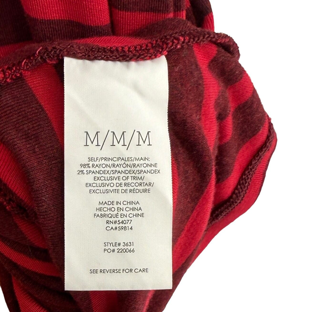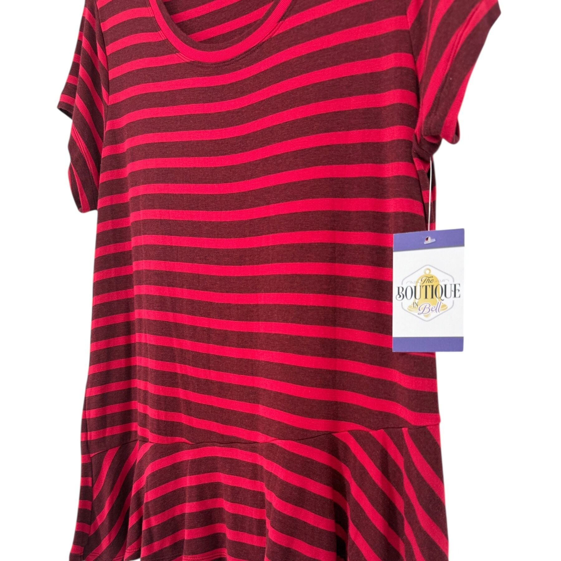 This Cabi top features a vibrant red and burgundy striped pattern, crafted from a soft rayon-spandex blend. The peplum hem adds a fashionable flair, while the short sleeves provide a casual yet elegant touch. Ideal for layering or wearing on its own, this versatile piece blends comfort and style effortlessly.
