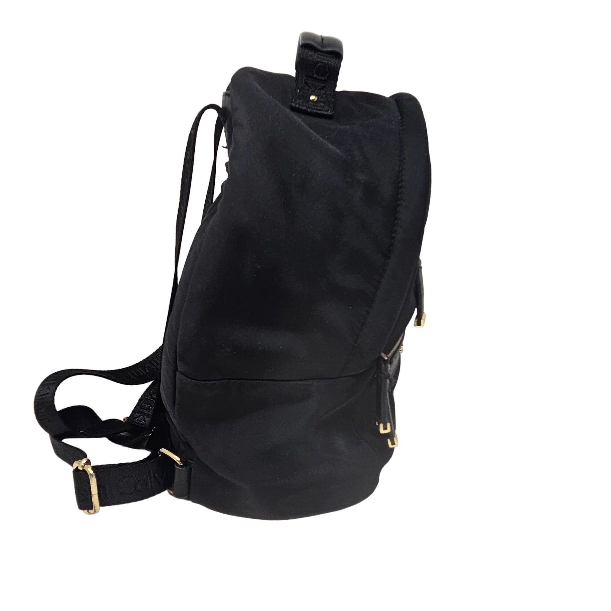 Sleek compact carryall perfect for everyday city use, travel, or hands-free outings, featuring streamlined silhouette with front zip stash and roomy interior compartments. Built with smooth black nylon and accented with gold-tone hardware for a polished look that pairs effortlessly with casual or elevated streetwear ensembles. Adjustable shoulder straps and top handle offer versatile carry options while multiple pockets keep essentials organized. Ideal for errands, weekend excursions, or as a chic travel companion that blends function and style.