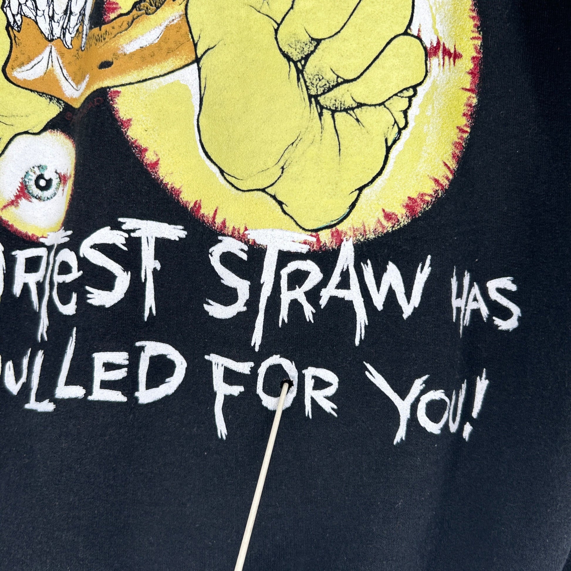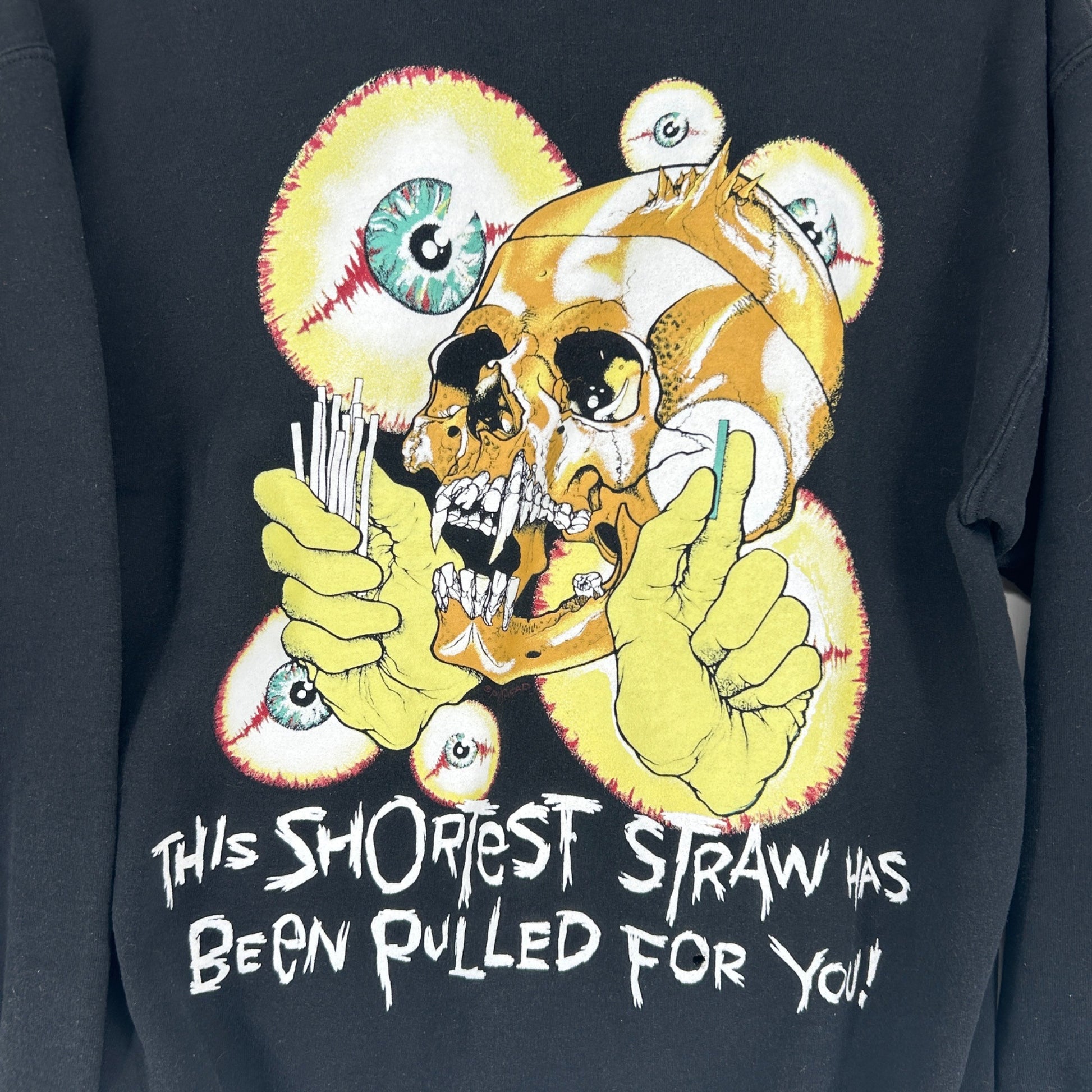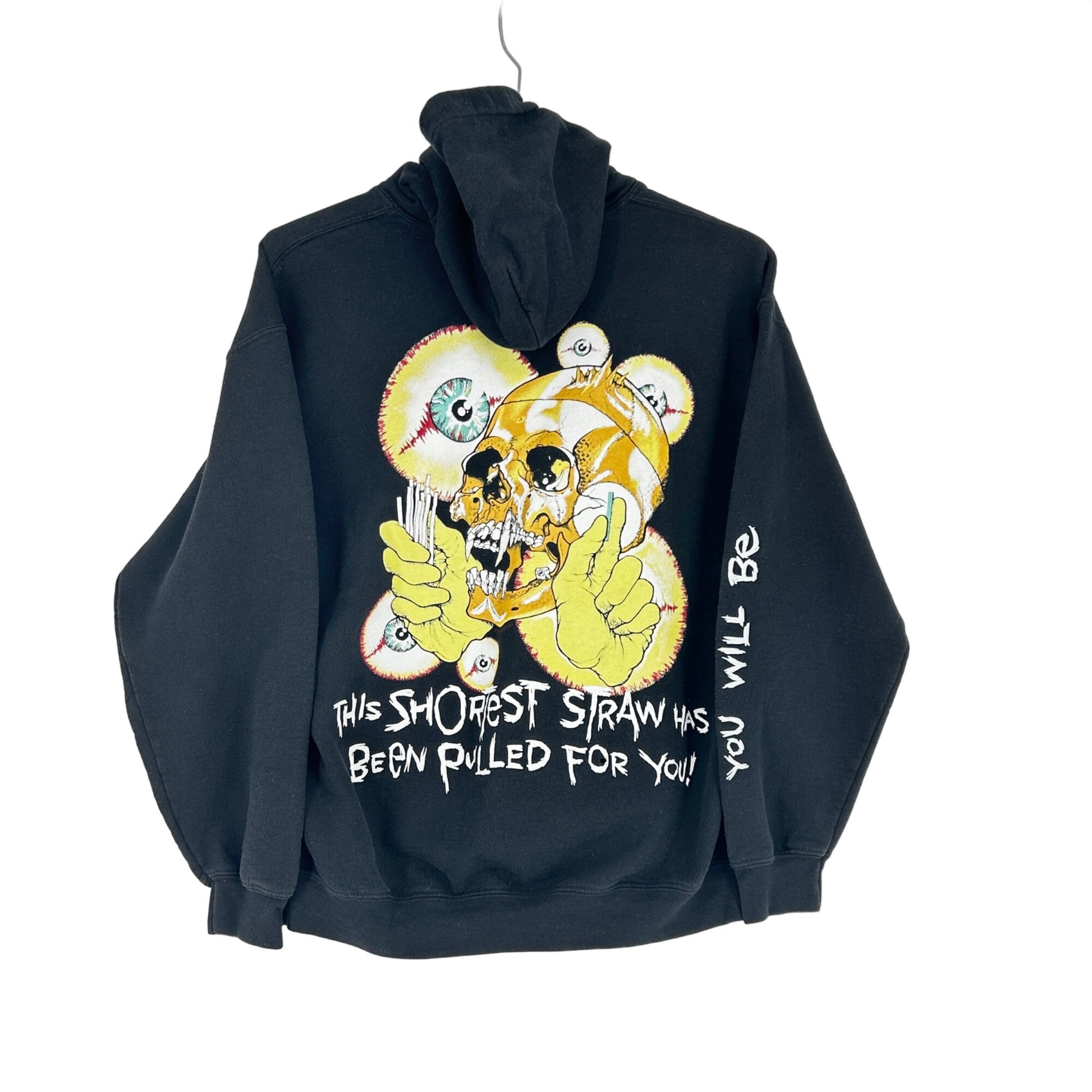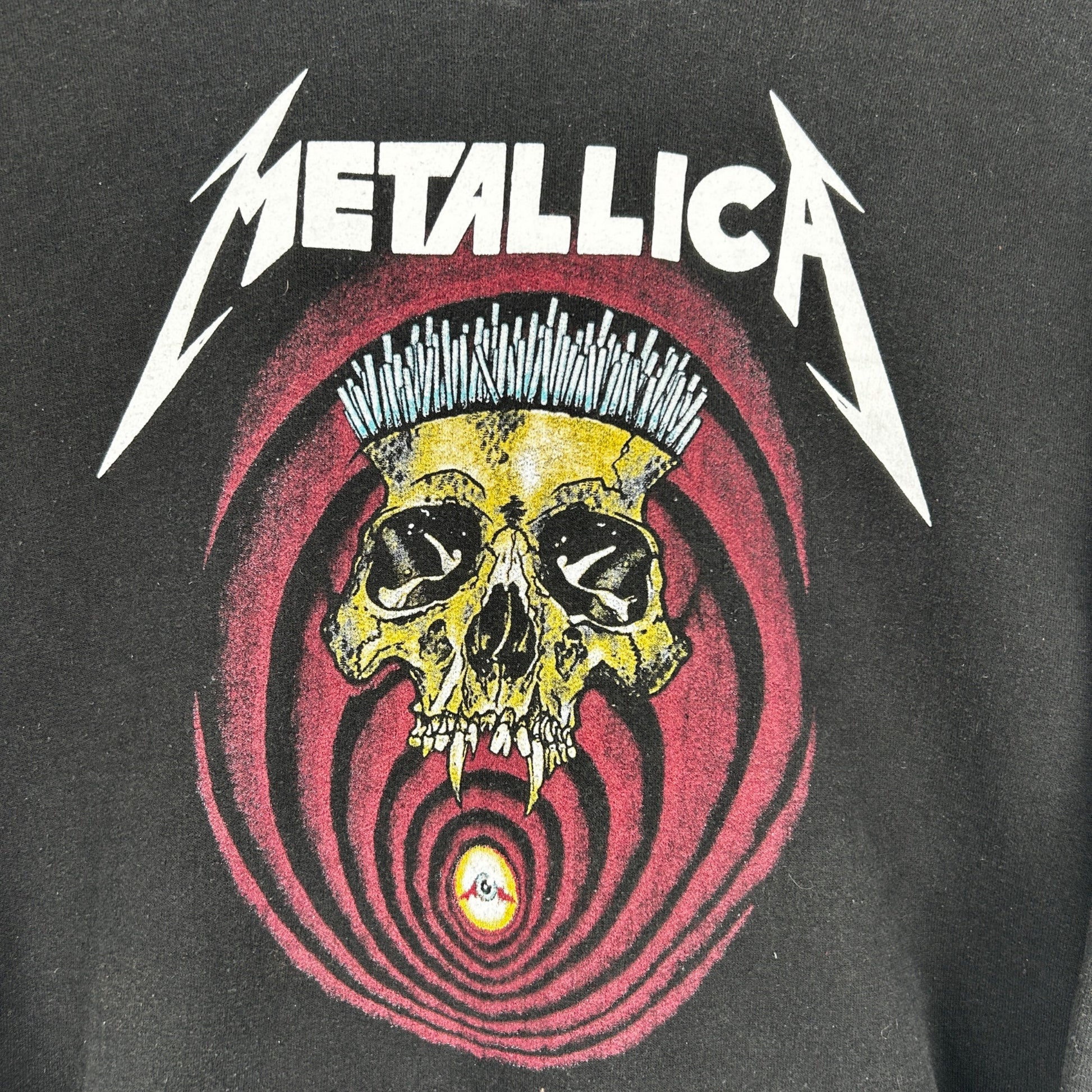 Iconic heavy metal tour imagery meets bold graphic impact in this black pullover hoodie featuring vivid skull artwork inspired by late eighties thrash era visuals and cult favorite song lyrics. Designed with a relaxed unisex fit this long sleeve sweatshirt showcases large front and back prints along with sleeve graphics that capture classic concert merch style. A standout piece for music collectors and streetwear fans it layers easily with denim or cargos for an edgy everyday look.