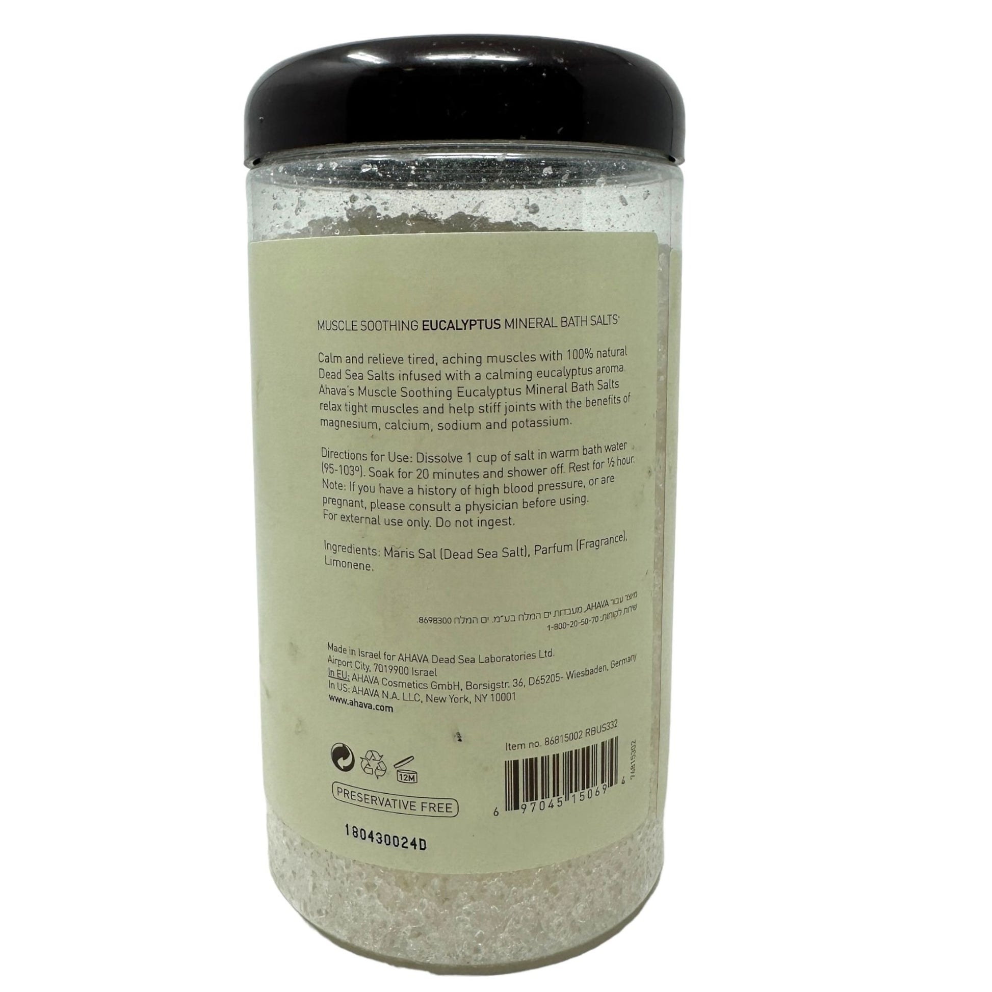 AHAVA Dead Sea Salt Mineral Bath Salt - Muscle Soothing Eucalyptus 32 Oz 907 g