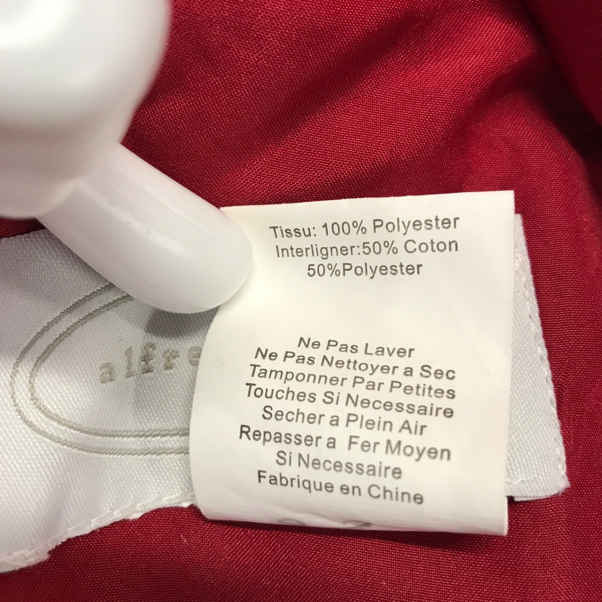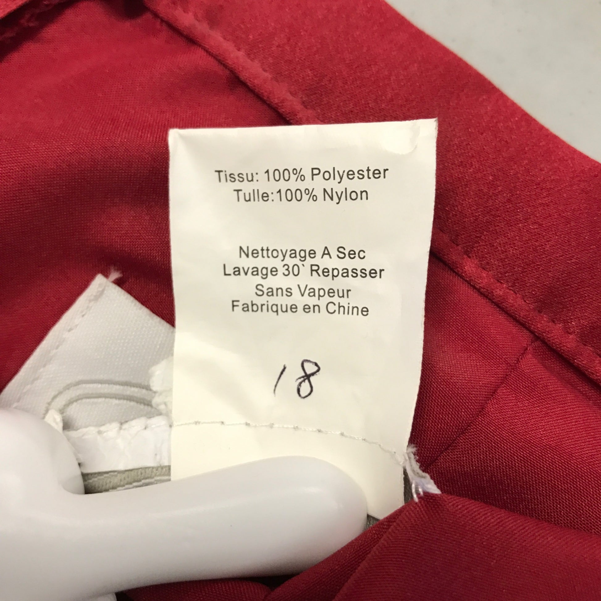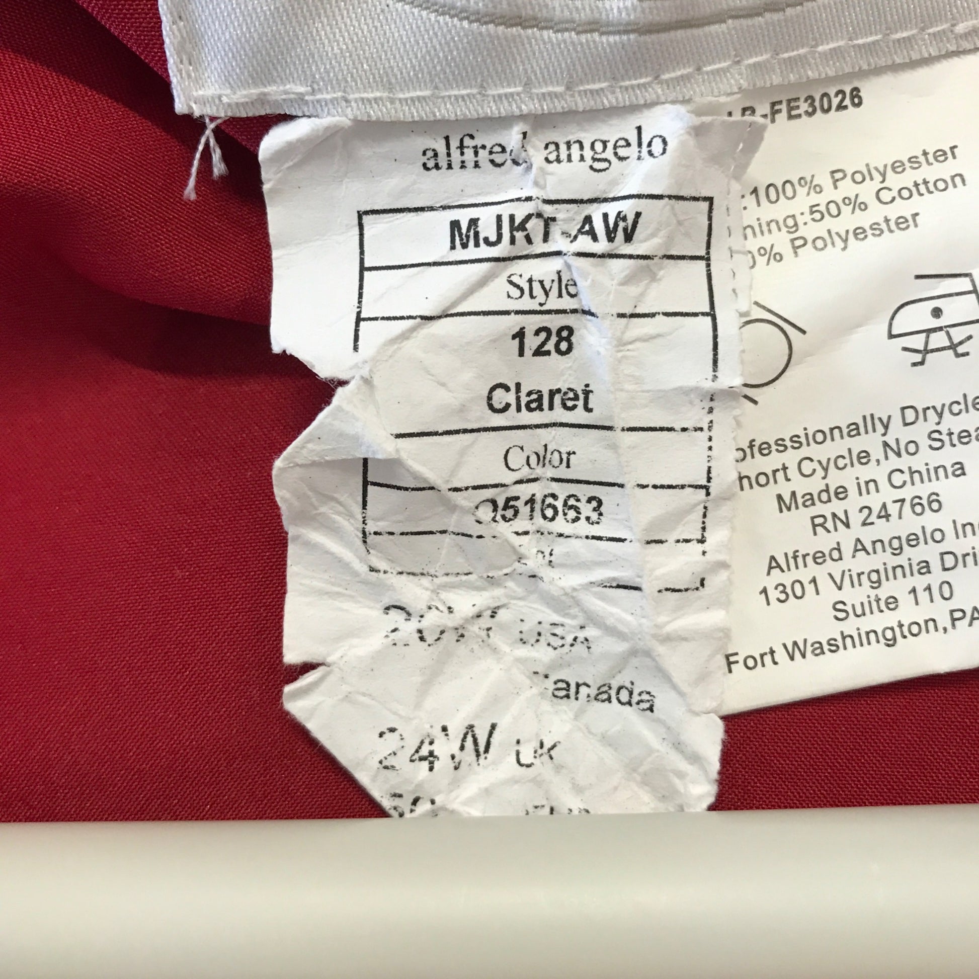 This Alfred Angelo three-piece formal ensemble in rich claret red features a strapless ruched floor-length skirt, a sleeveless embroidered and beaded top, and a short-sleeve cropped bolero jacket. Elegant and timeless, this set is ideal for bridesmaids, formal events, or holiday parties. The detailed beadwork on the top and the dramatic cascading draping on the skirt add sophistication and shape. Made of 100% polyester with cotton-poly interlining, the garments are labeled style 128 and were made in China.