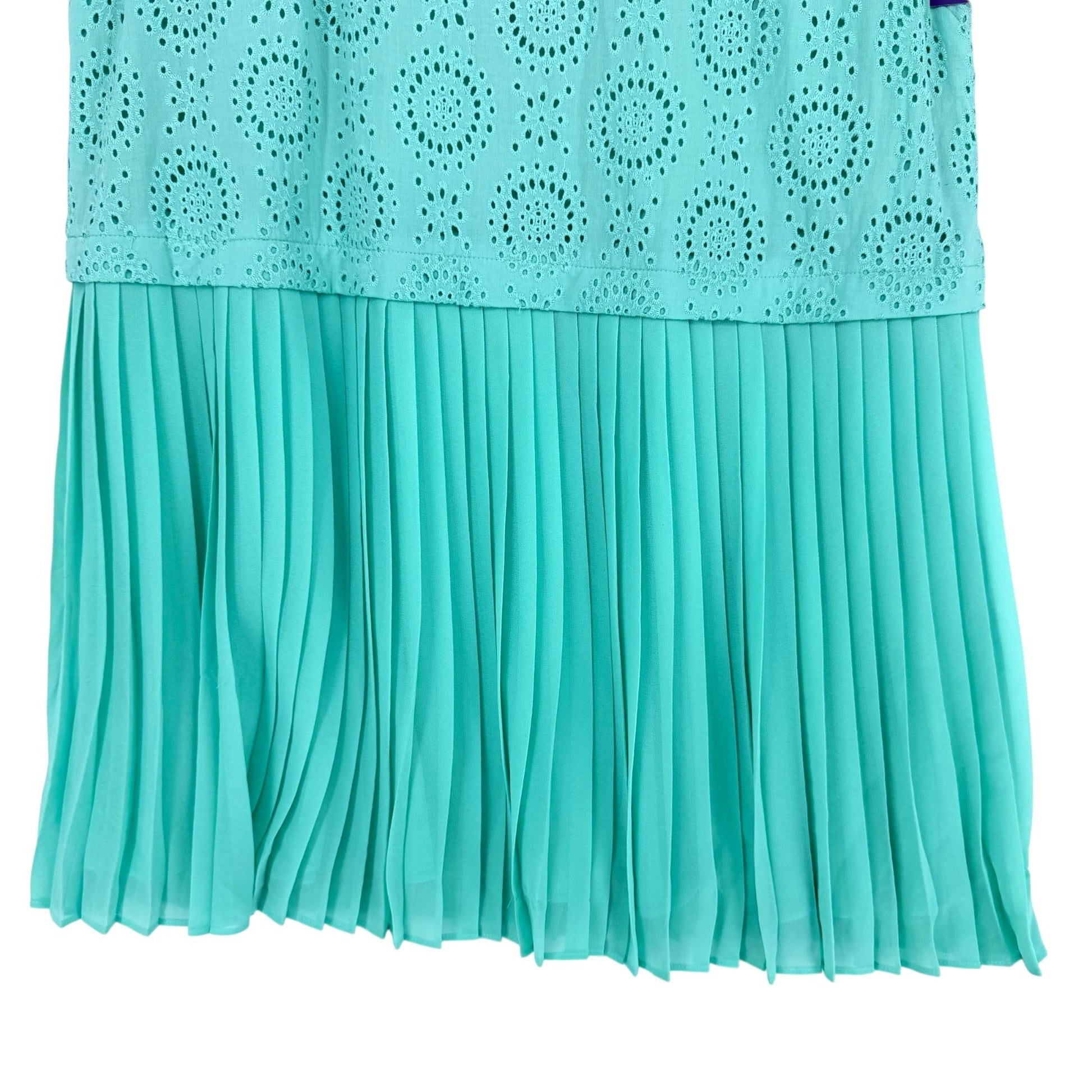 Green sleeveless dress with a perforated eyelet bodice and flowing pleated skirt for a breezy silhouette ideal for daytime events, brunches, or summer evenings.