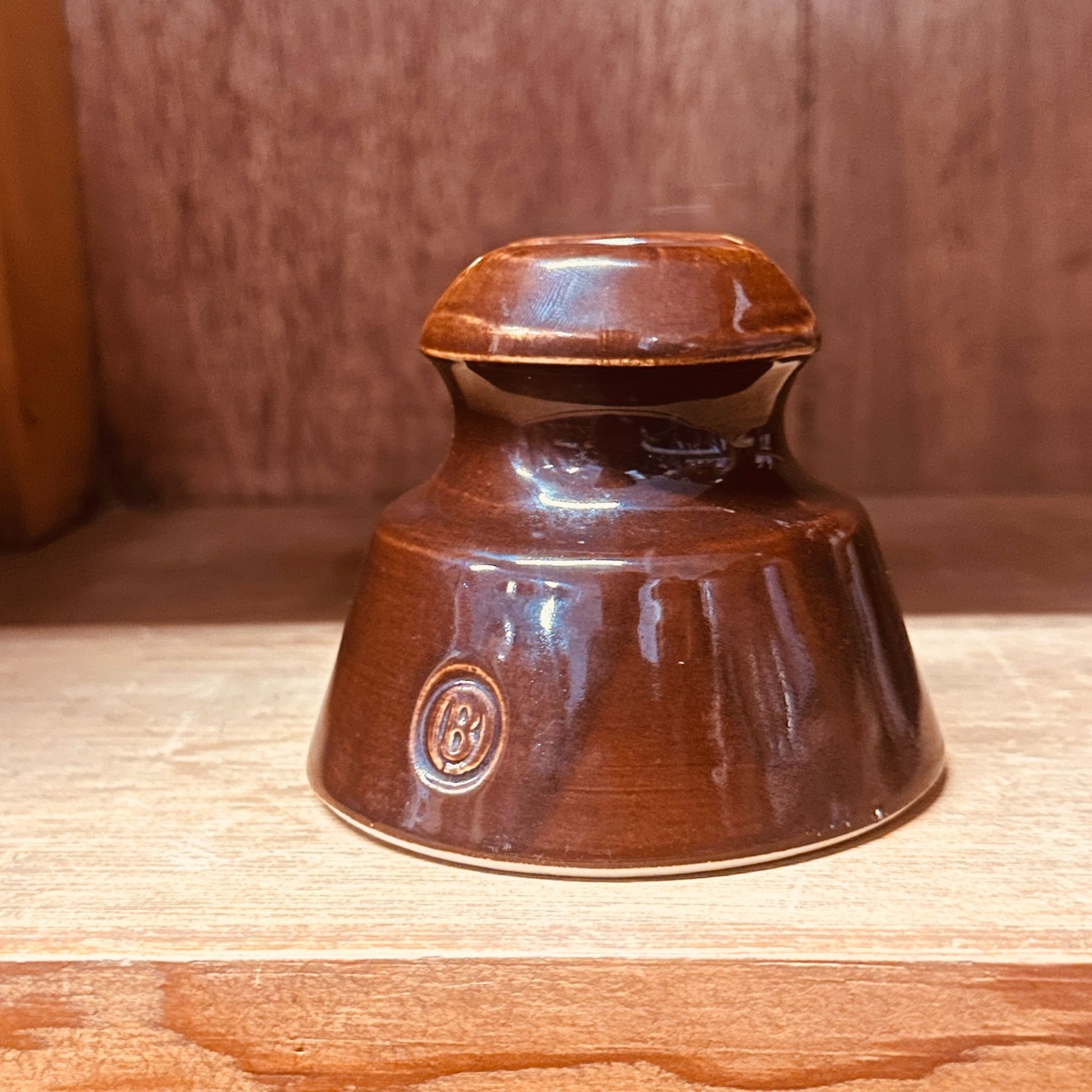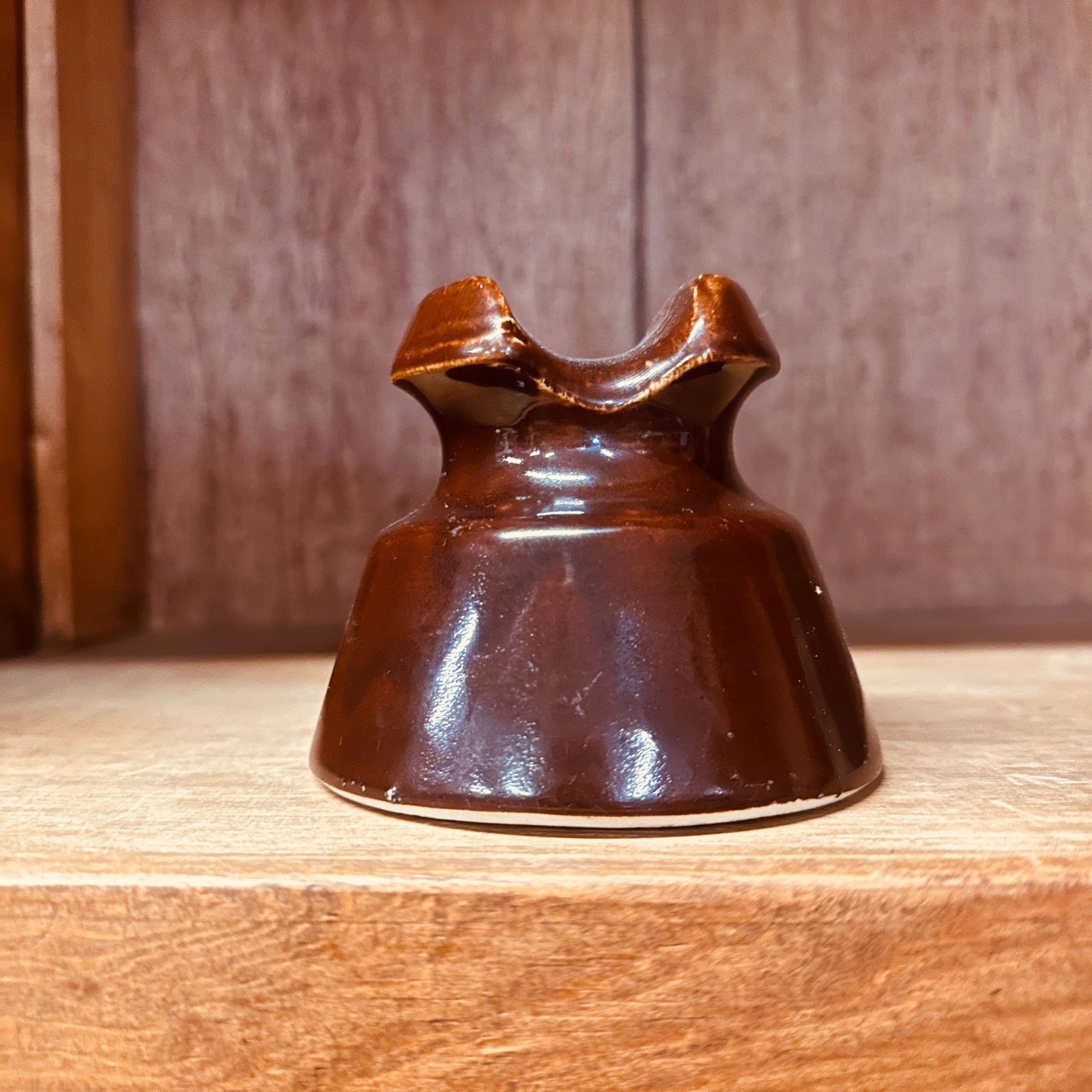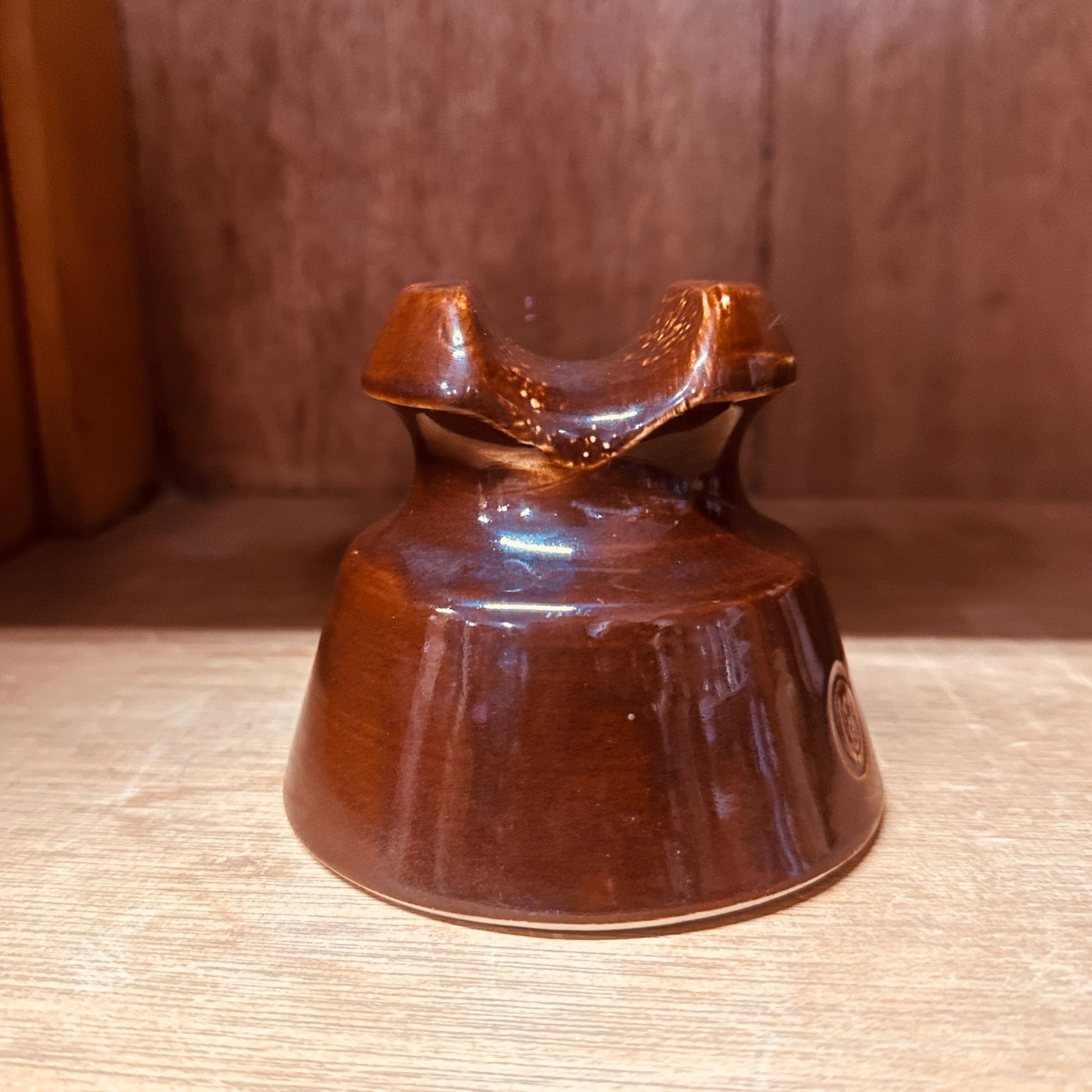 Rich brown glazed ceramic, classic industrial accents, and collectible utility hardware come together in this compact vintage insulator featuring the distinctive (B) mark used by Ohio Brass on early electrical components. Its sculptural form, glossy finish, and authentic manufacturing details make it a striking piece for décor, display, or repurposed art. Whether styled as a paperweight, shelf accent, or added to a growing insulator collection, it offers a timeless blend of history and craftsmanship with warm industrial charm.