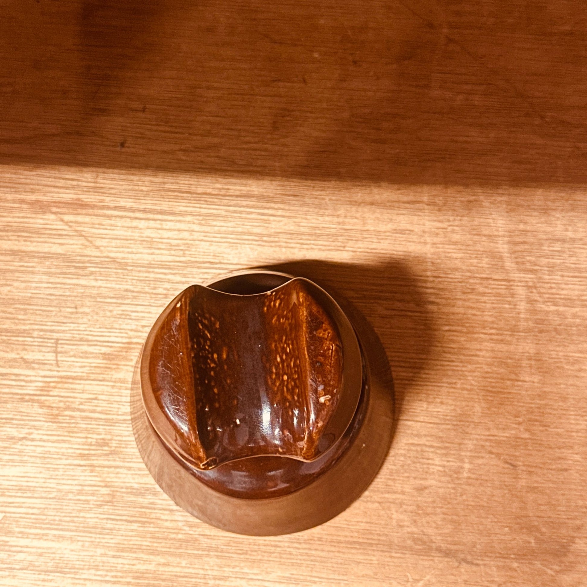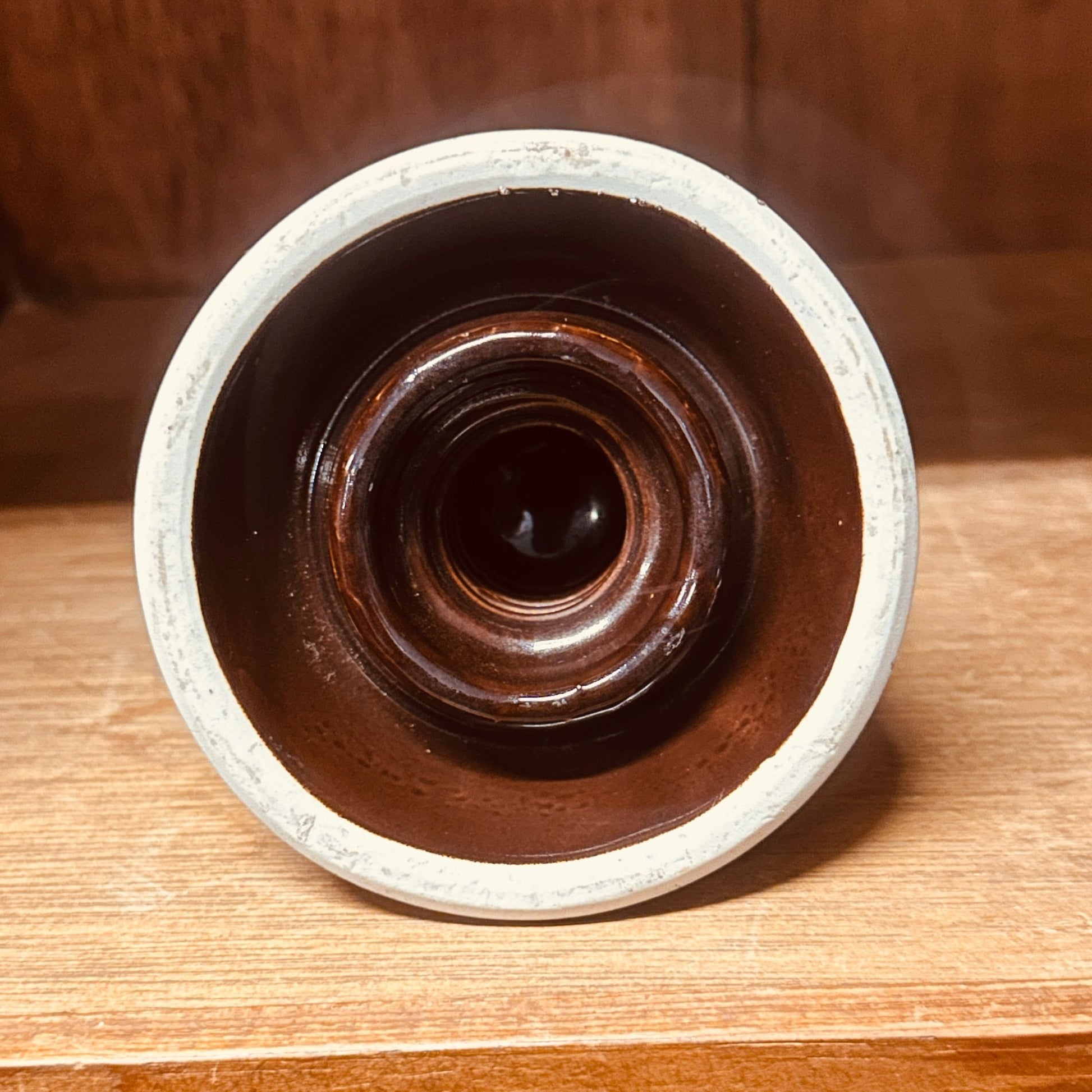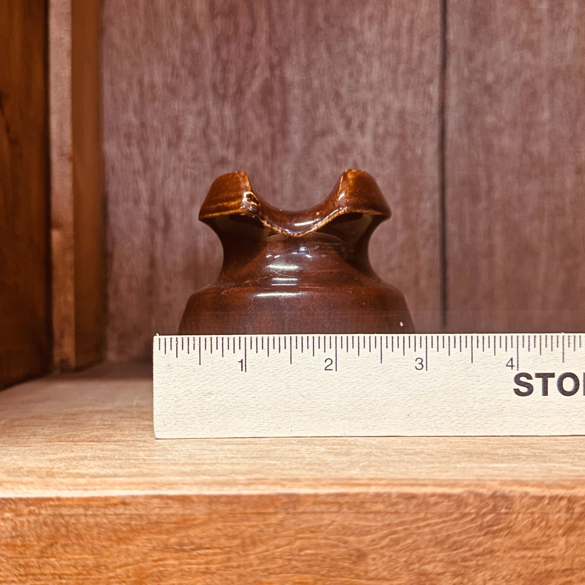 Rich brown glazed ceramic, classic industrial accents, and collectible utility hardware come together in this compact vintage insulator featuring the distinctive (B) mark used by Ohio Brass on early electrical components. Its sculptural form, glossy finish, and authentic manufacturing details make it a striking piece for décor, display, or repurposed art. Whether styled as a paperweight, shelf accent, or added to a growing insulator collection, it offers a timeless blend of history and craftsmanship with warm industrial charm.