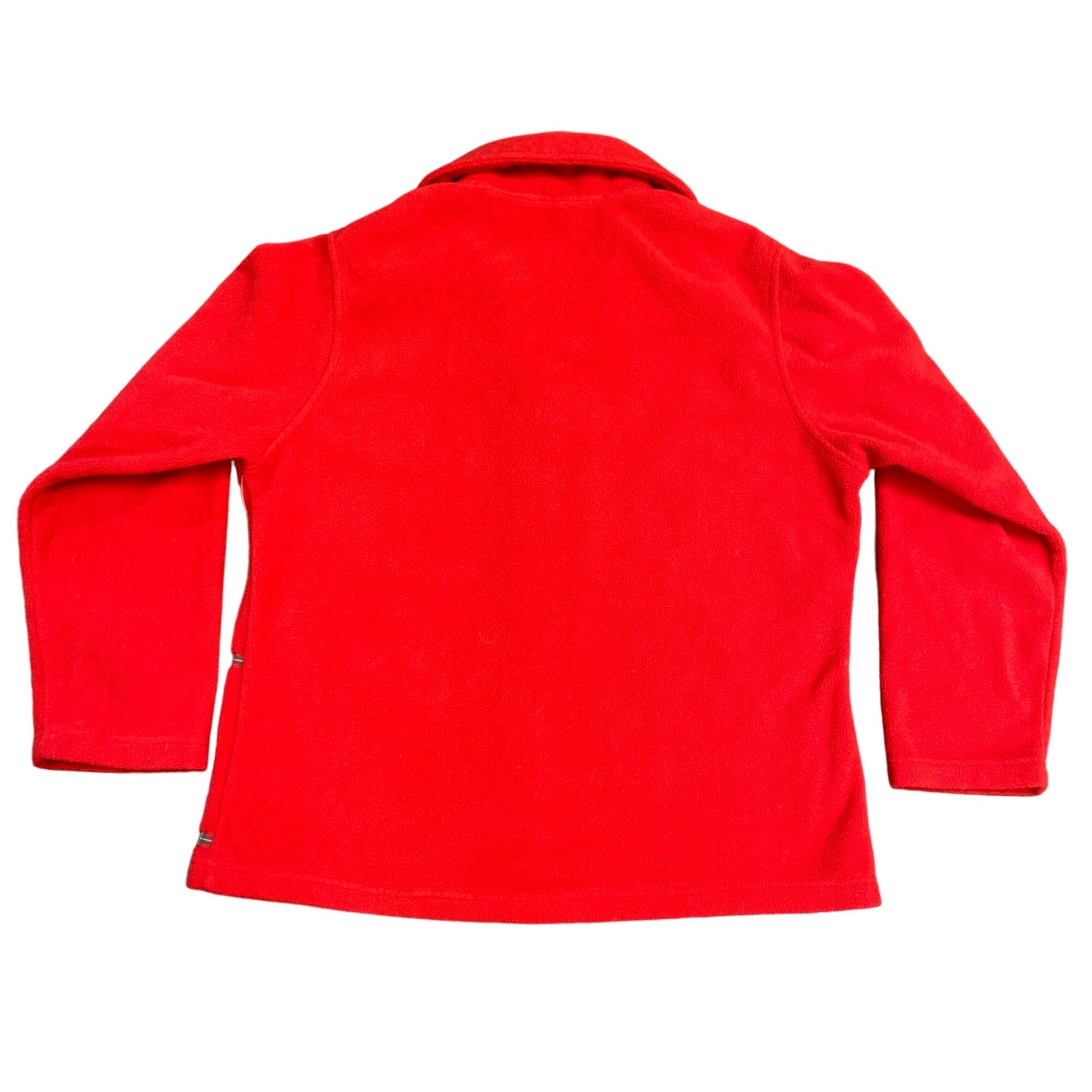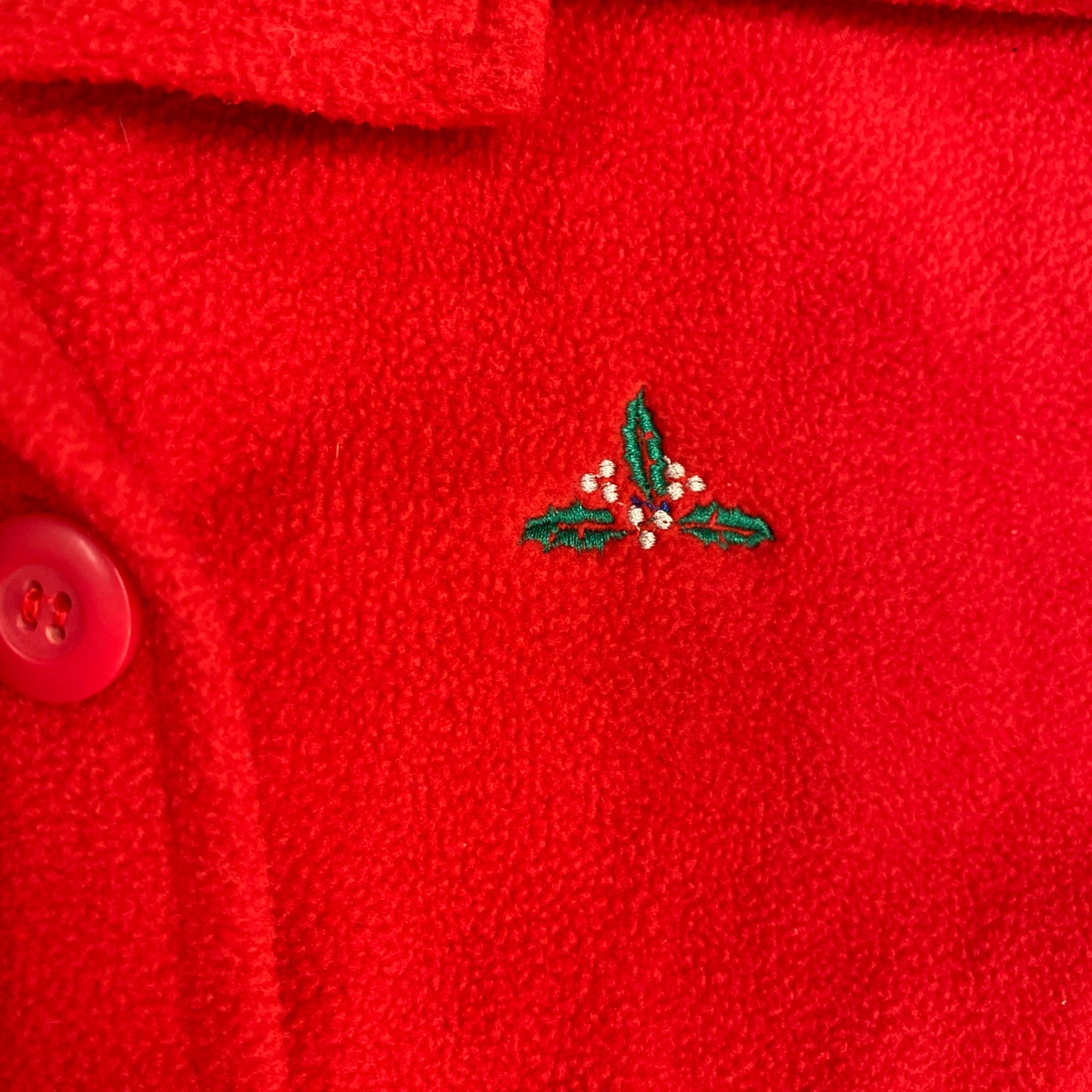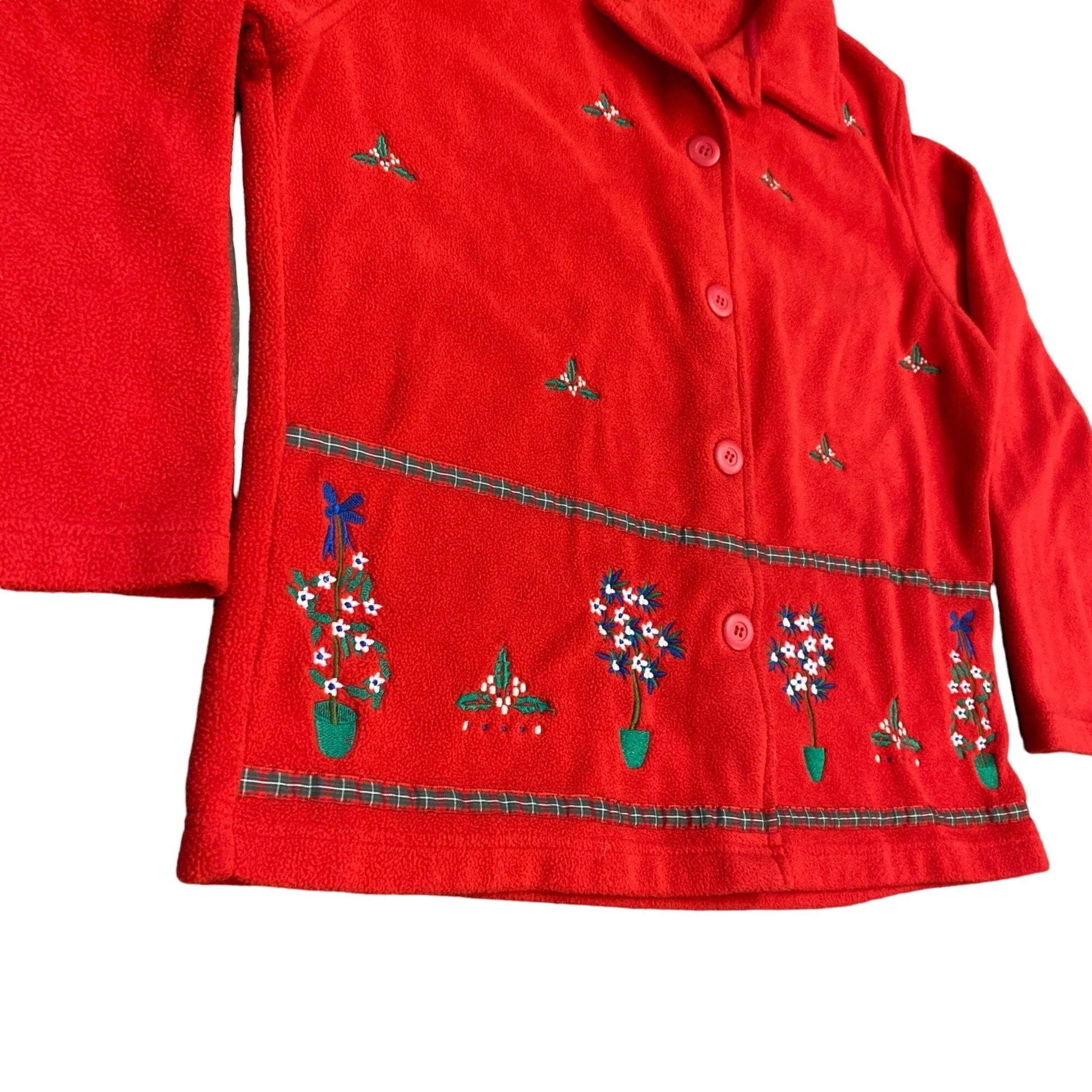 This Classic Elements red fleece shirt jacket in size small is the perfect cozy piece for the holidays, featuring festive embroidered Christmas topiary trees, holly accents, and plaid trim details. Made from soft 100% polyester fleece, it has a button front closure, collared neckline, and versatile shirt-jacket style that works for layering or wearing on its own. A cheerful and nostalgic holiday piece to brighten up your winter wardrobe.
