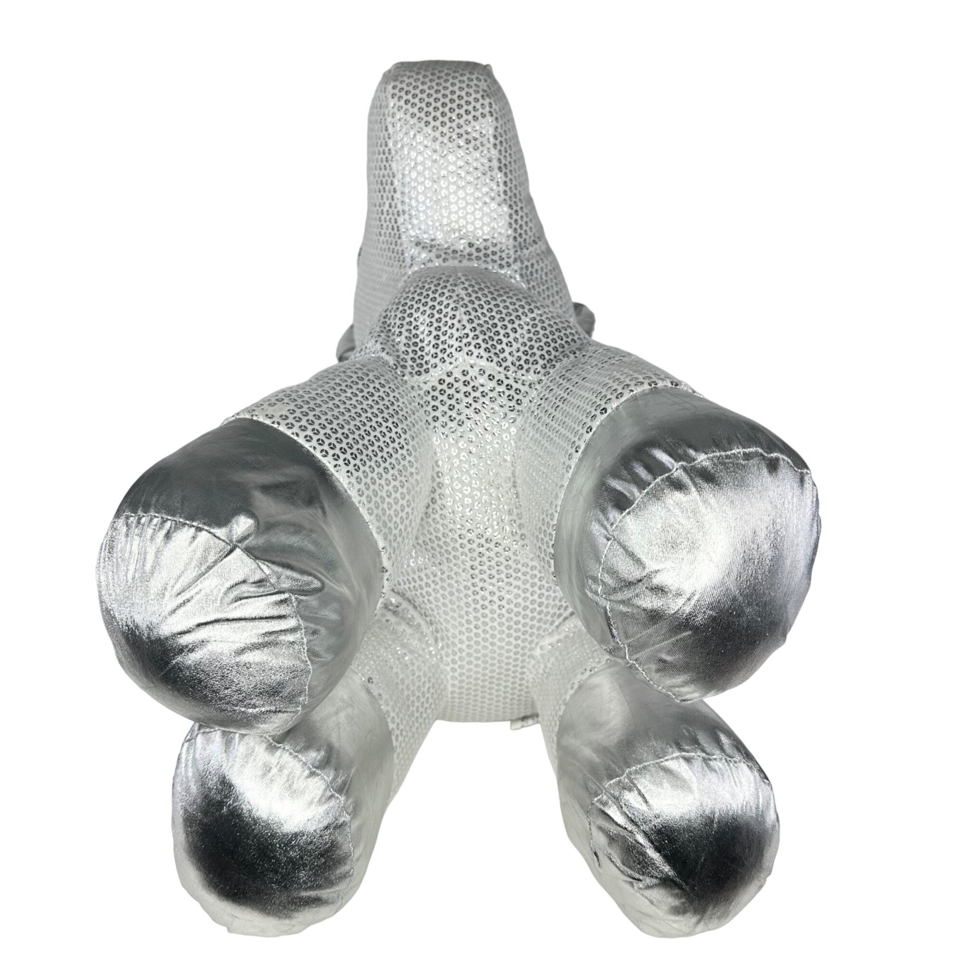 This delightful unicorn plush embodies whimsy and sparkle, featuring a metallic silver body adorned with sequins, a vibrant rainbow mane, and a charming red heart patch detail. Its enchanting blue eyes and soft texture make it both a visual and tactile wonder, evoking a magical charm sure to captivate plush lovers and unicorn admirers.