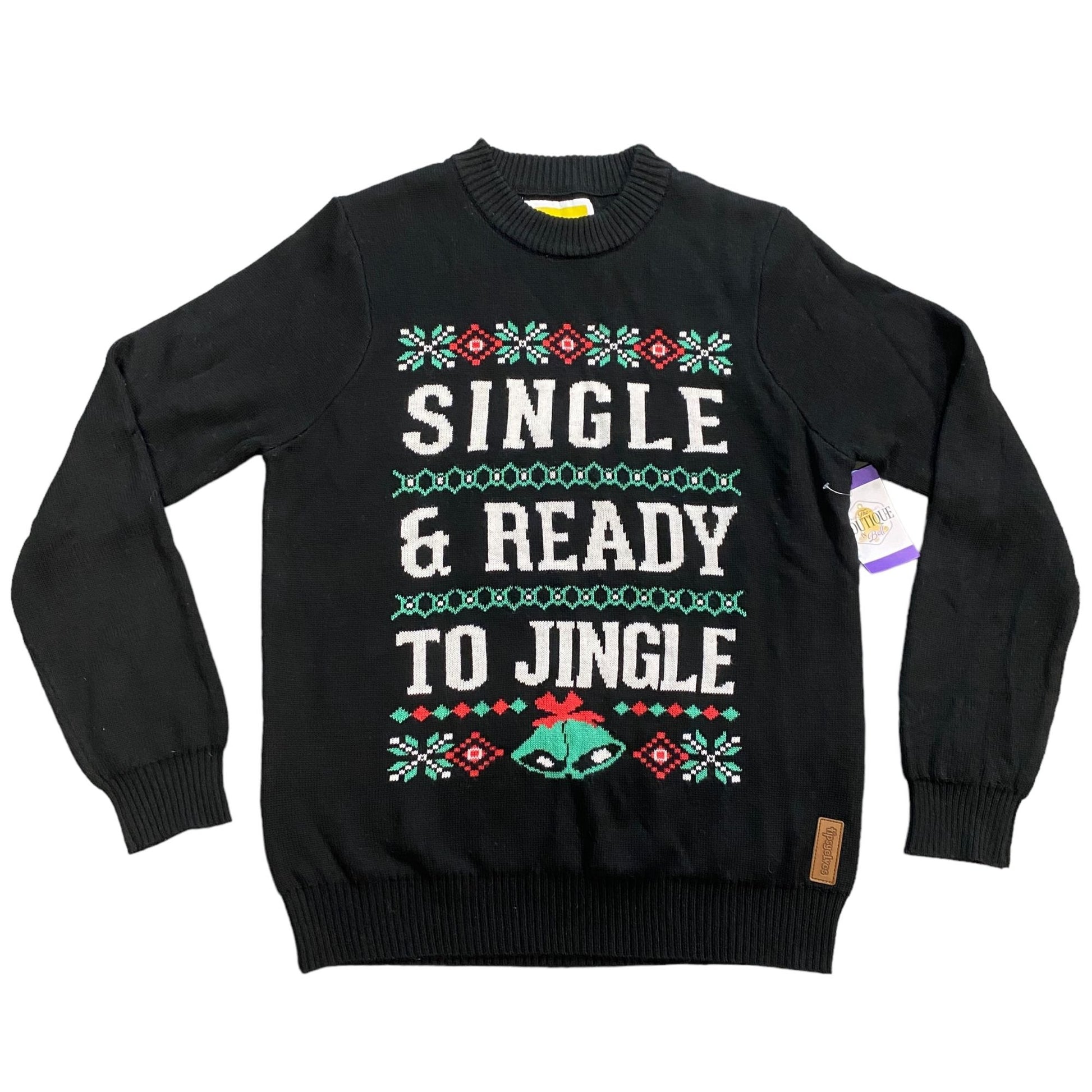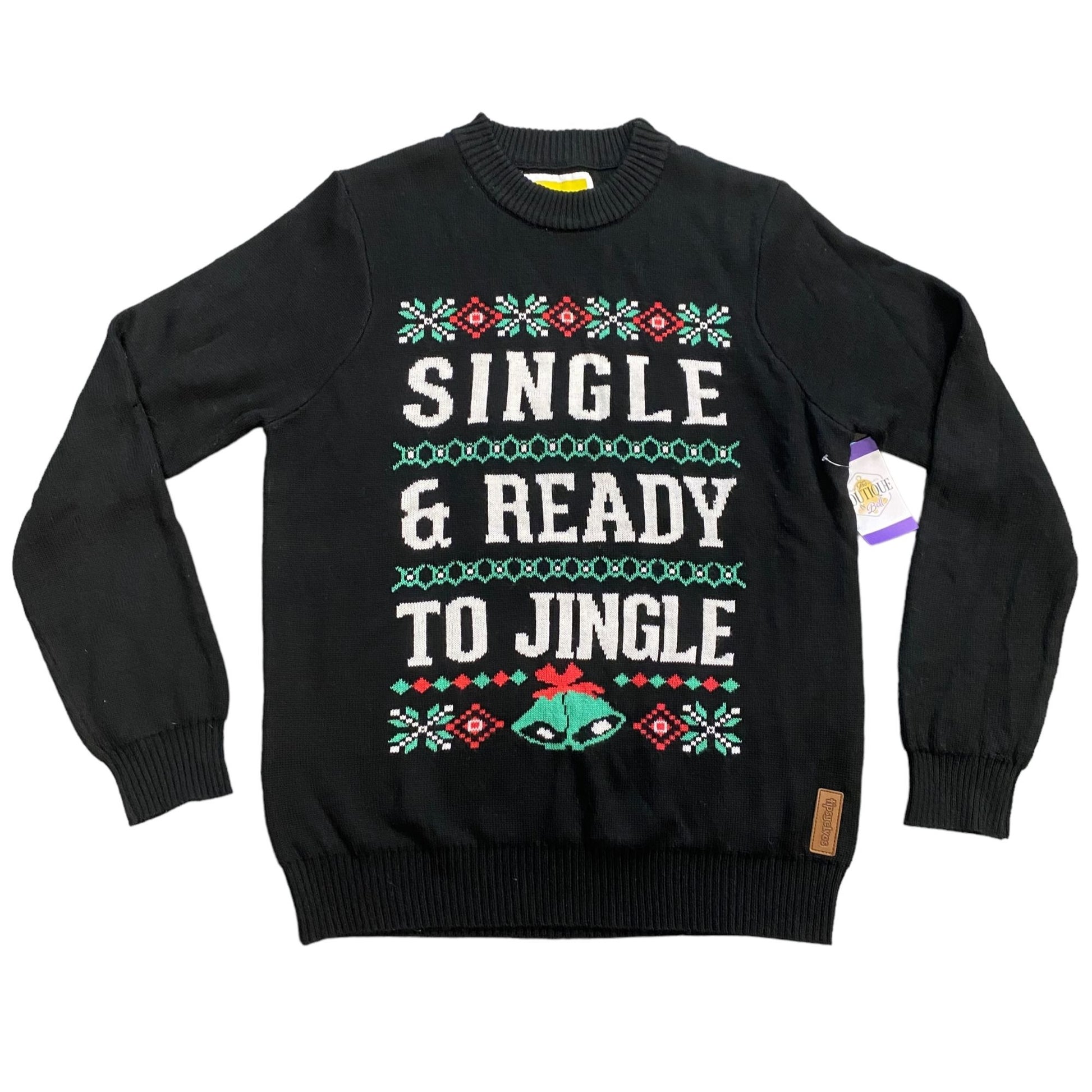 Tipsy Elves men’s medium Christmas sweater in black featuring bold white lettering that reads "Single & Ready to Jingle" with festive snowflakes and jingle bell graphics. Made from 100% acrylic with ribbed cuffs and hem, this crew neck holiday sweater blends comfort with humor—perfect for parties, ugly sweater contests, or seasonal celebrations.