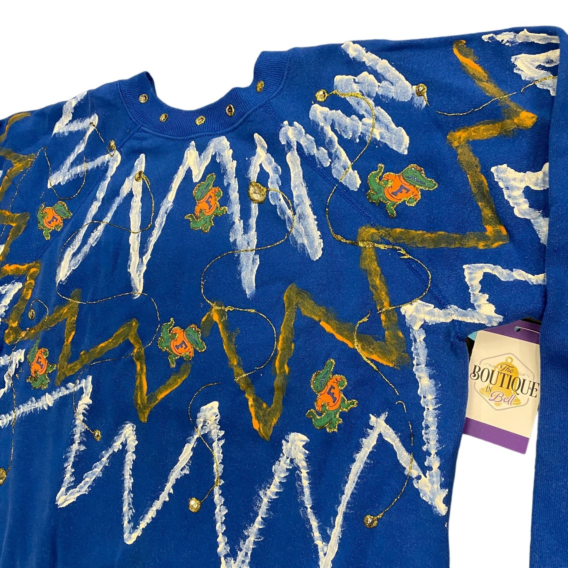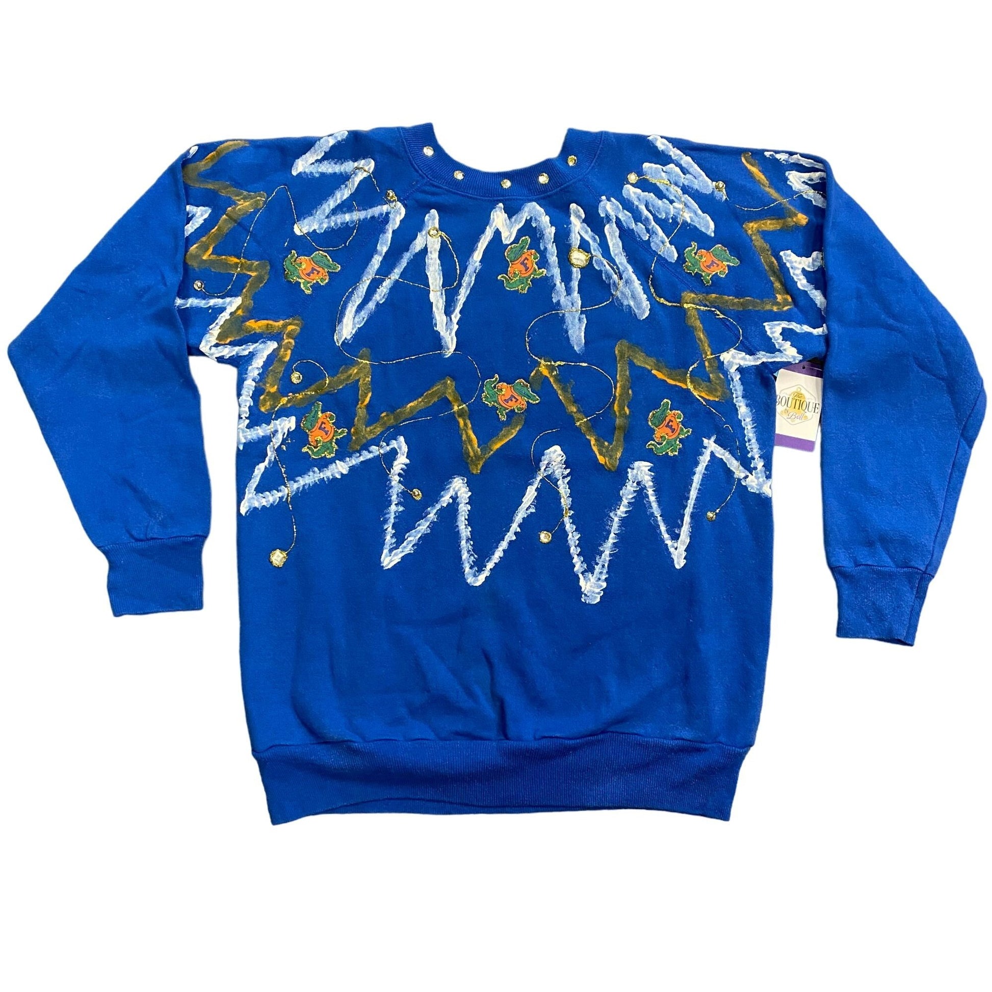 Show your Florida Gators pride in this vintage Hanes sweatshirt, featuring hand crafted bold zig-zag paint, sequin accents, and embroidered mascots on a bright blue cotton blend. Made in the USA, this crew neck pullover brings a unique, hand-decorated flair with rhinestones at the collar and playful Albert Gator graphics. Perfect for collectors or fans, it offers a roomy Large fit with a soft fleece interior for comfort and warmth.