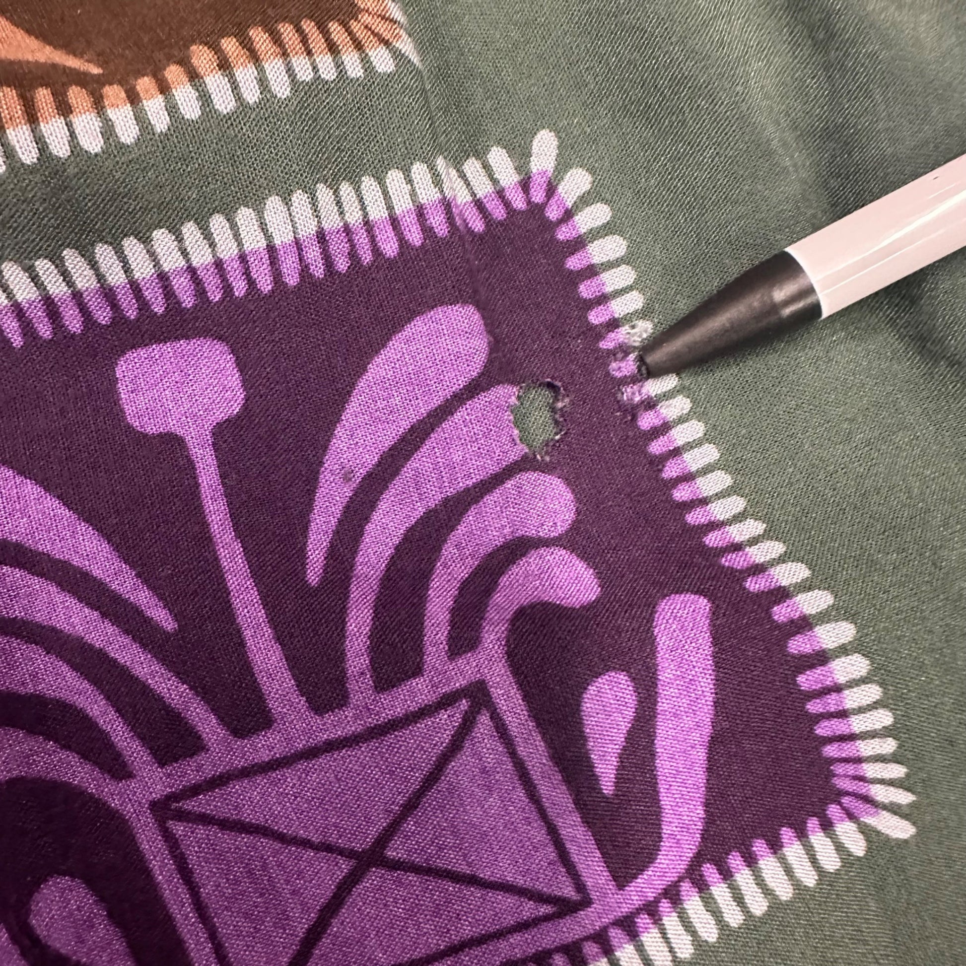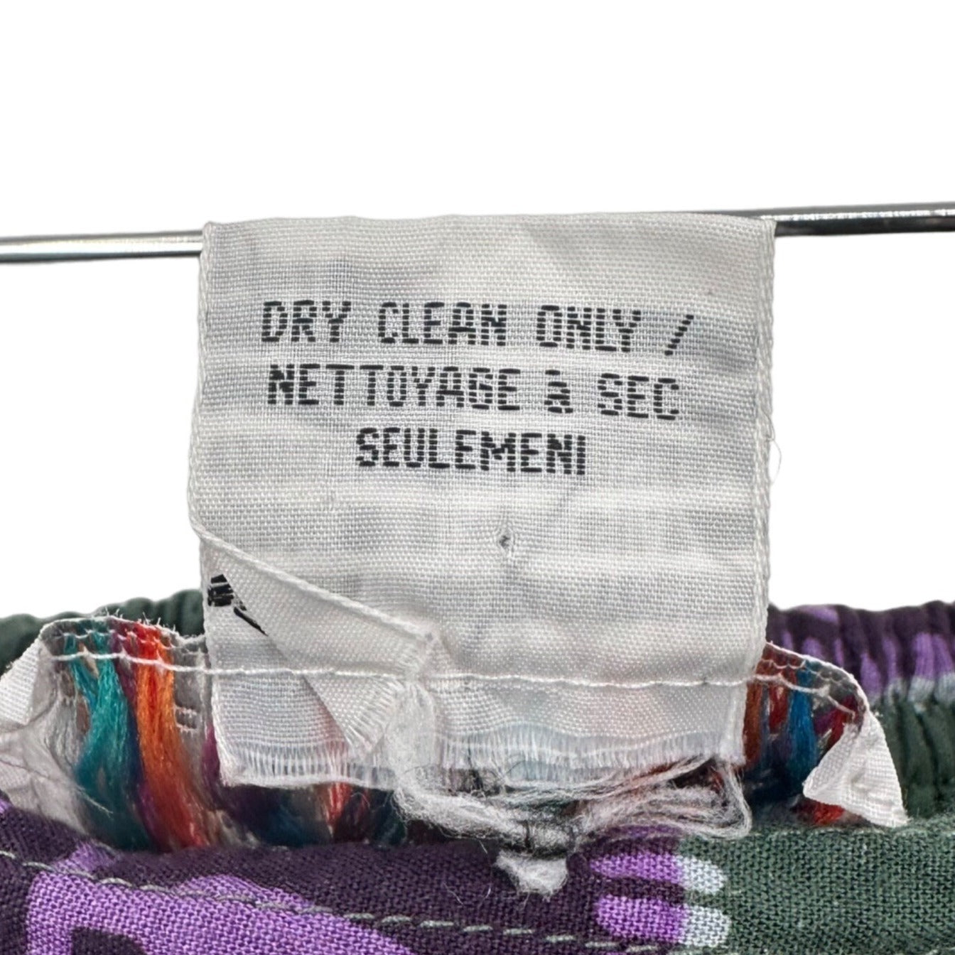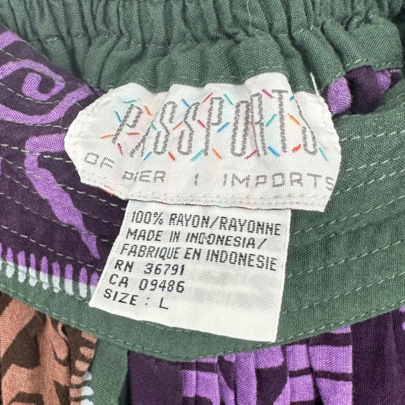 This vintage Passports size L full-length skirt features a soft 100% rayon fabric in a rich green tone, adorned with a bold tribal-inspired print in purple, teal, and brown. Designed for comfort and flow, it includes an elastic waist and side pockets, offering an effortlessly stylish and modest fit perfect for casual or bohemian looks. Likely from the late 1980s to early 1990s, this skirt blends retro charm with versatile wearability, ideal for collectors or everyday vintage fashion lovers.