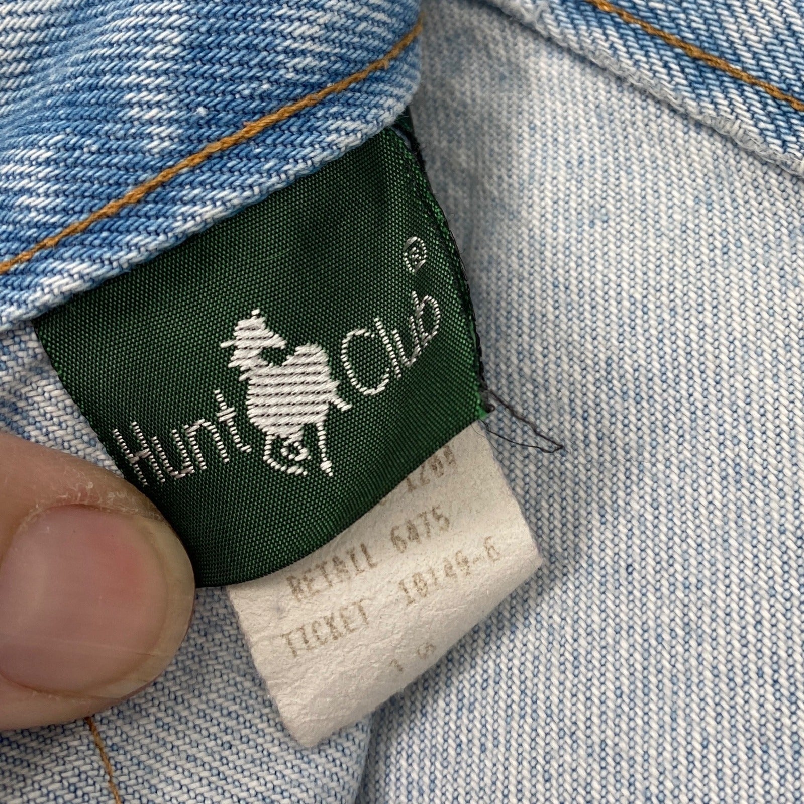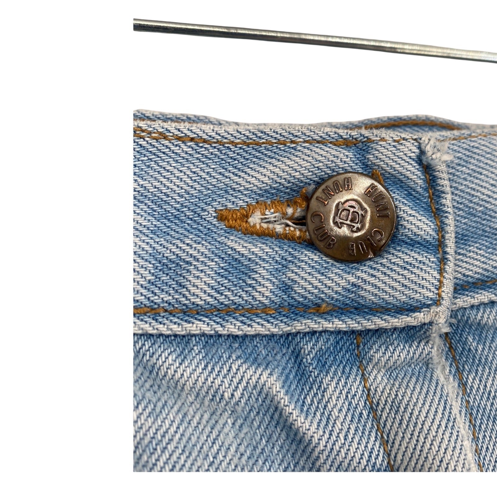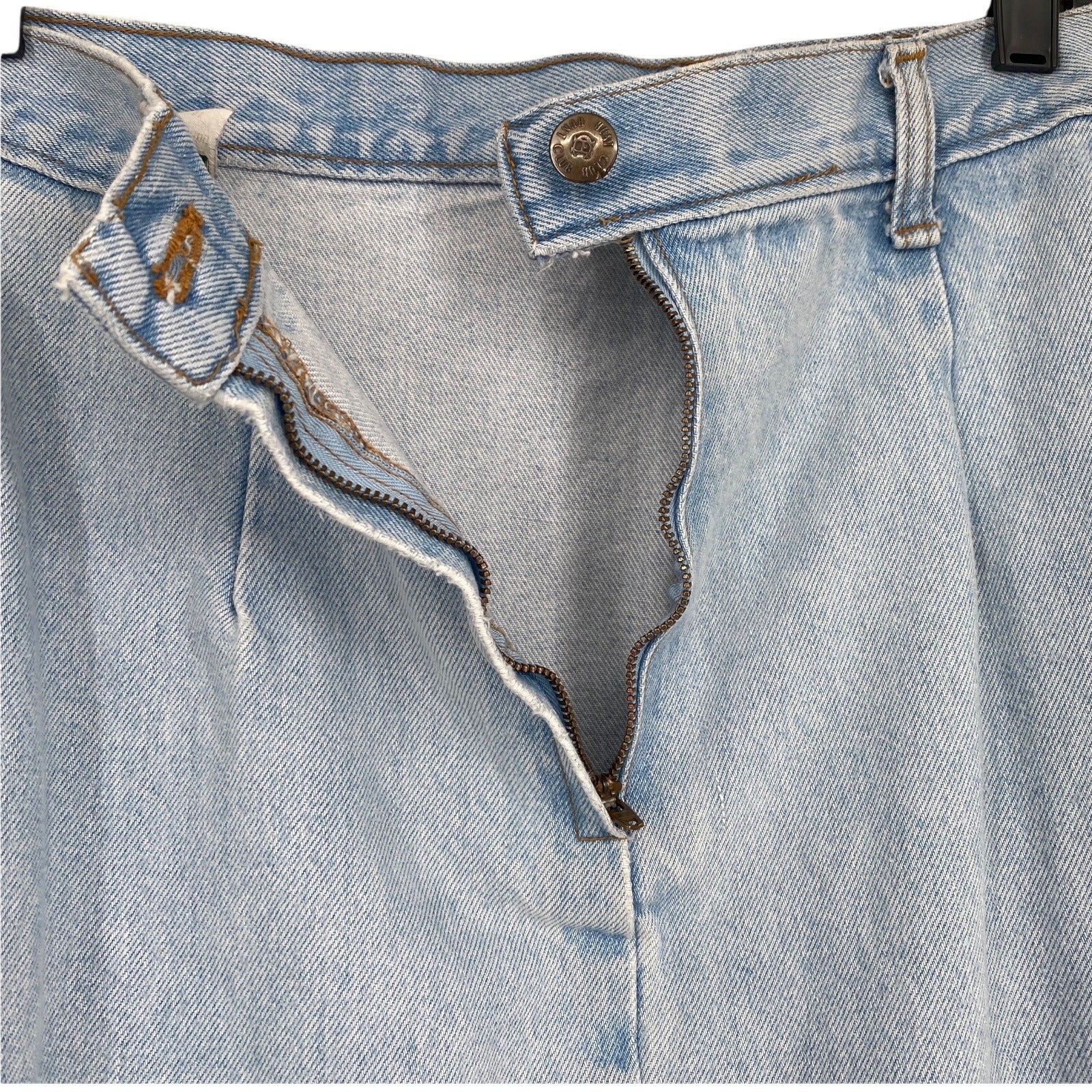 This vintage Hunt Club full-length denim skirt features classic 100% cotton construction in a light wash blue. Designed with a timeless high waist, zip fly with button closure, belt loops, and a modest back kick pleat for comfortable movement. The sturdy denim has a flattering straight cut, offering both structure and softness. Made in the USA and tagged a size 10, this piece embodies quality and durability. A versatile wardrobe staple that transitions effortlessly from casual everyday wear to retro-inspired styling.
