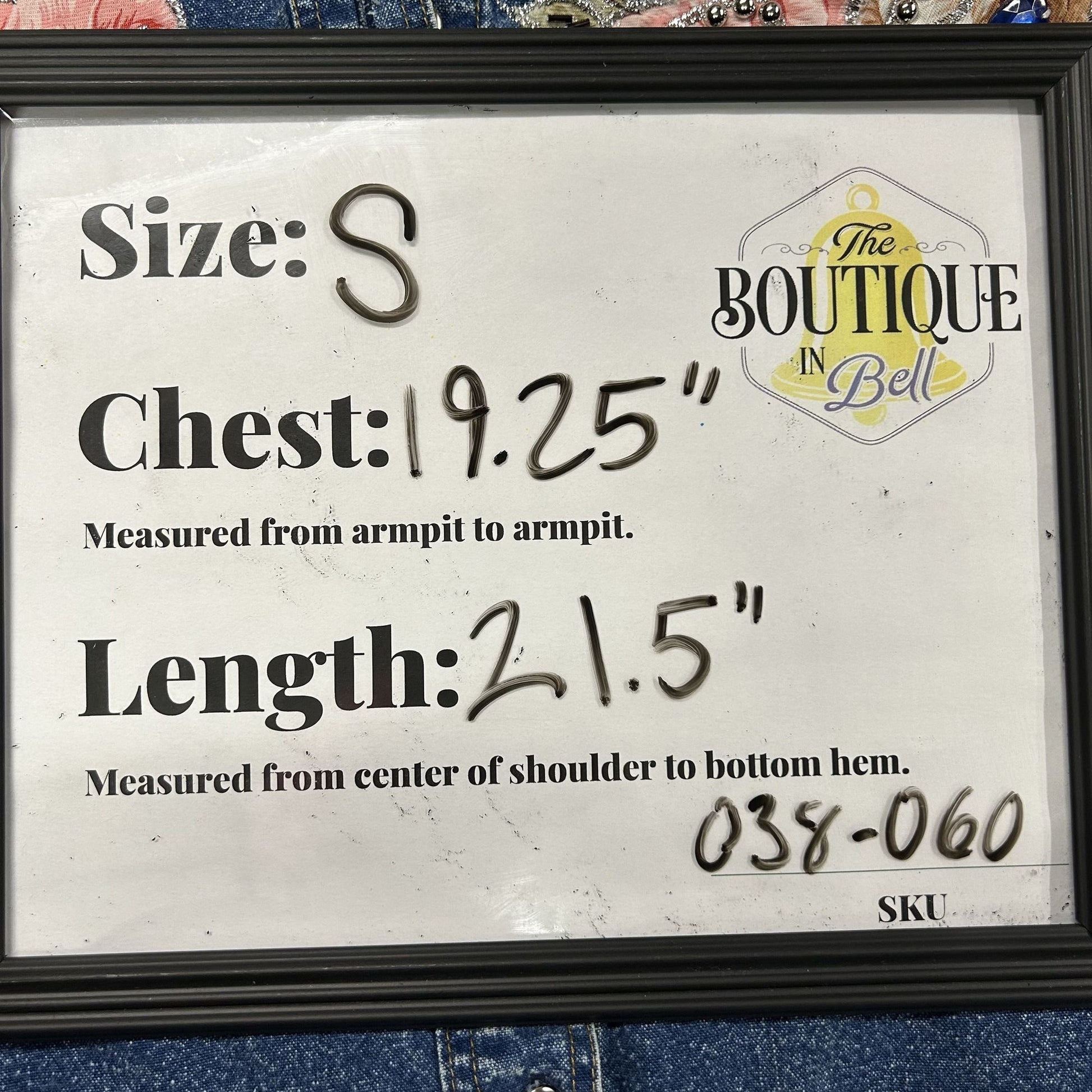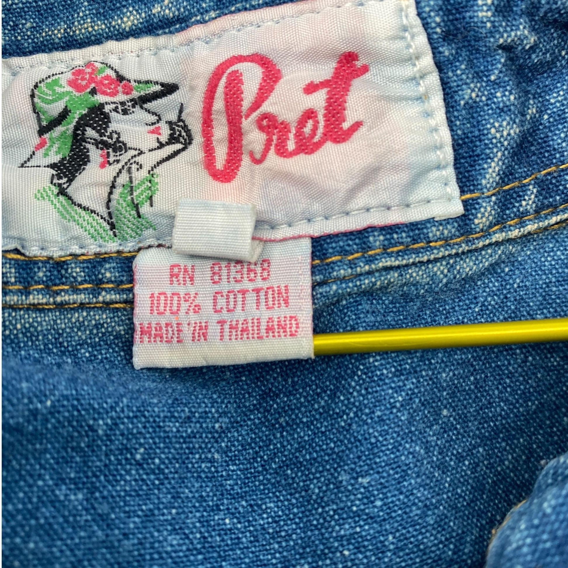 This vintage blouse by Pret combines 80s and 90s flair with acid washed denim, metallic embroidered roses, and bedazzled accents. Perfect for adding a retro touch to your wardrobe. This women's size small offers a retro, boxy fit.