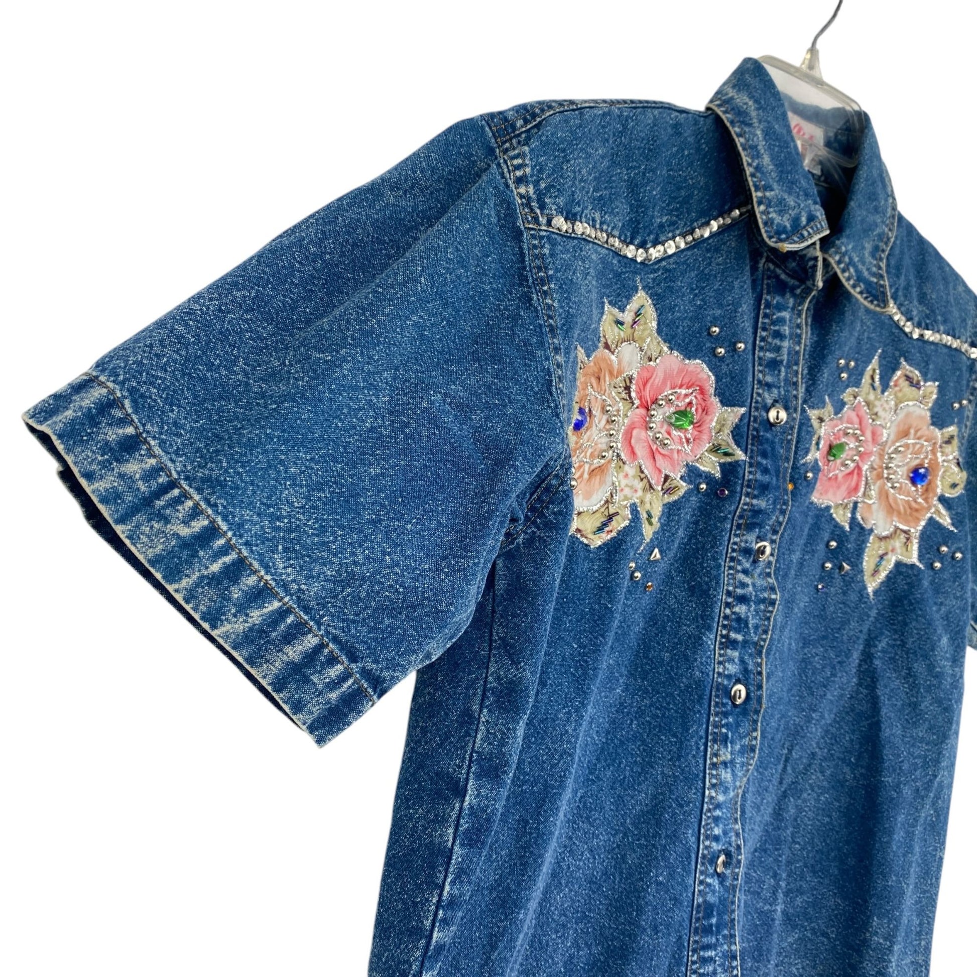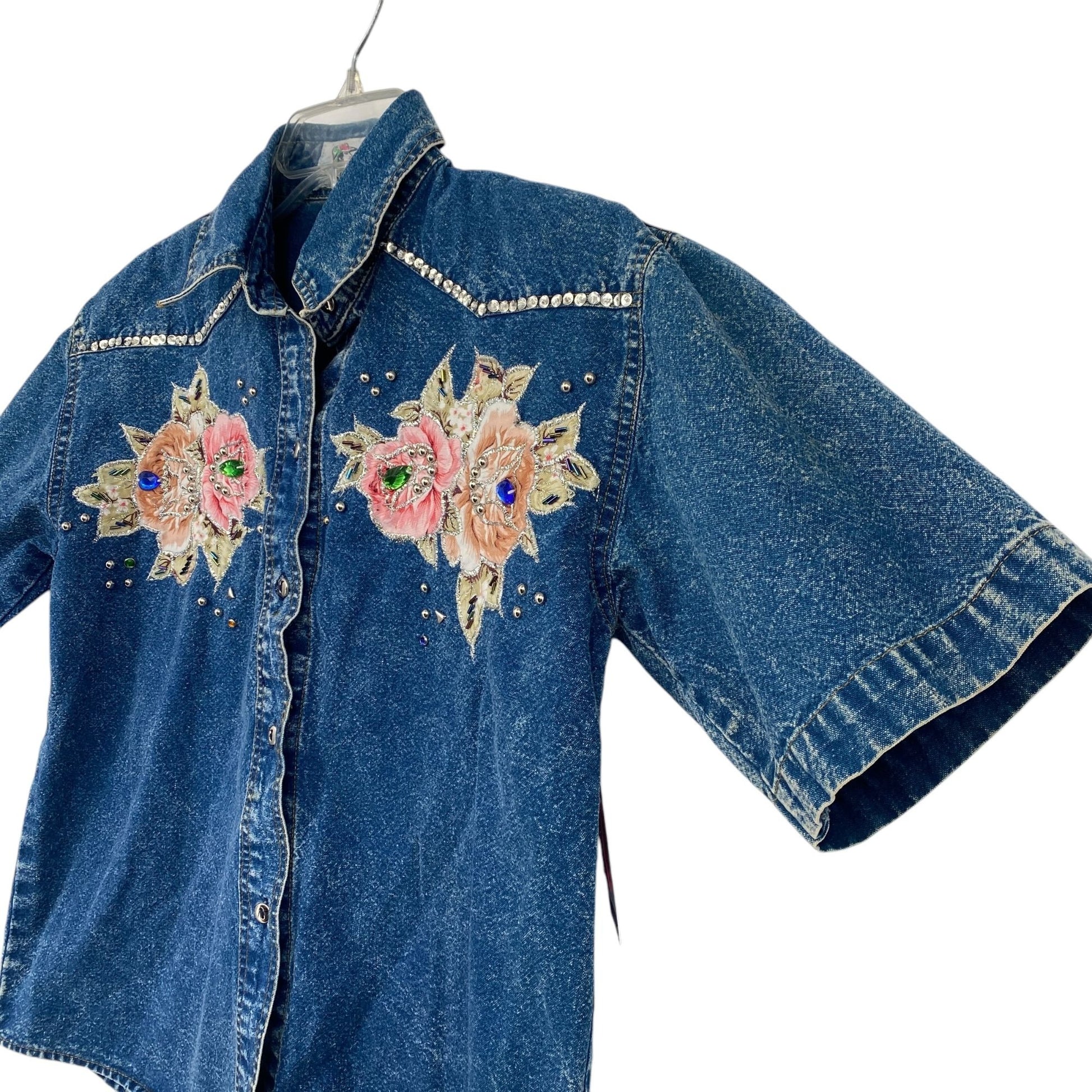 Vintage Pret Denim Shirt Blue 80s 90s Acid Wash Embroidered Roses Bedazzled