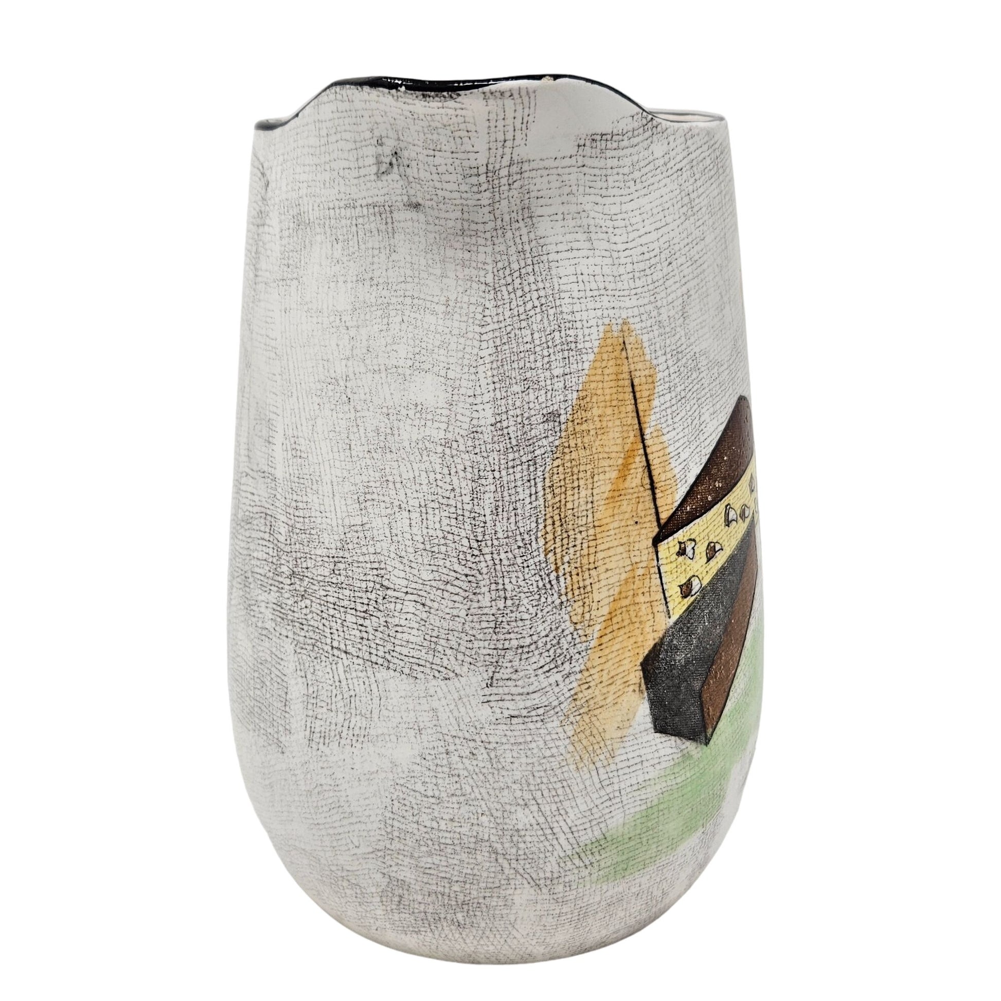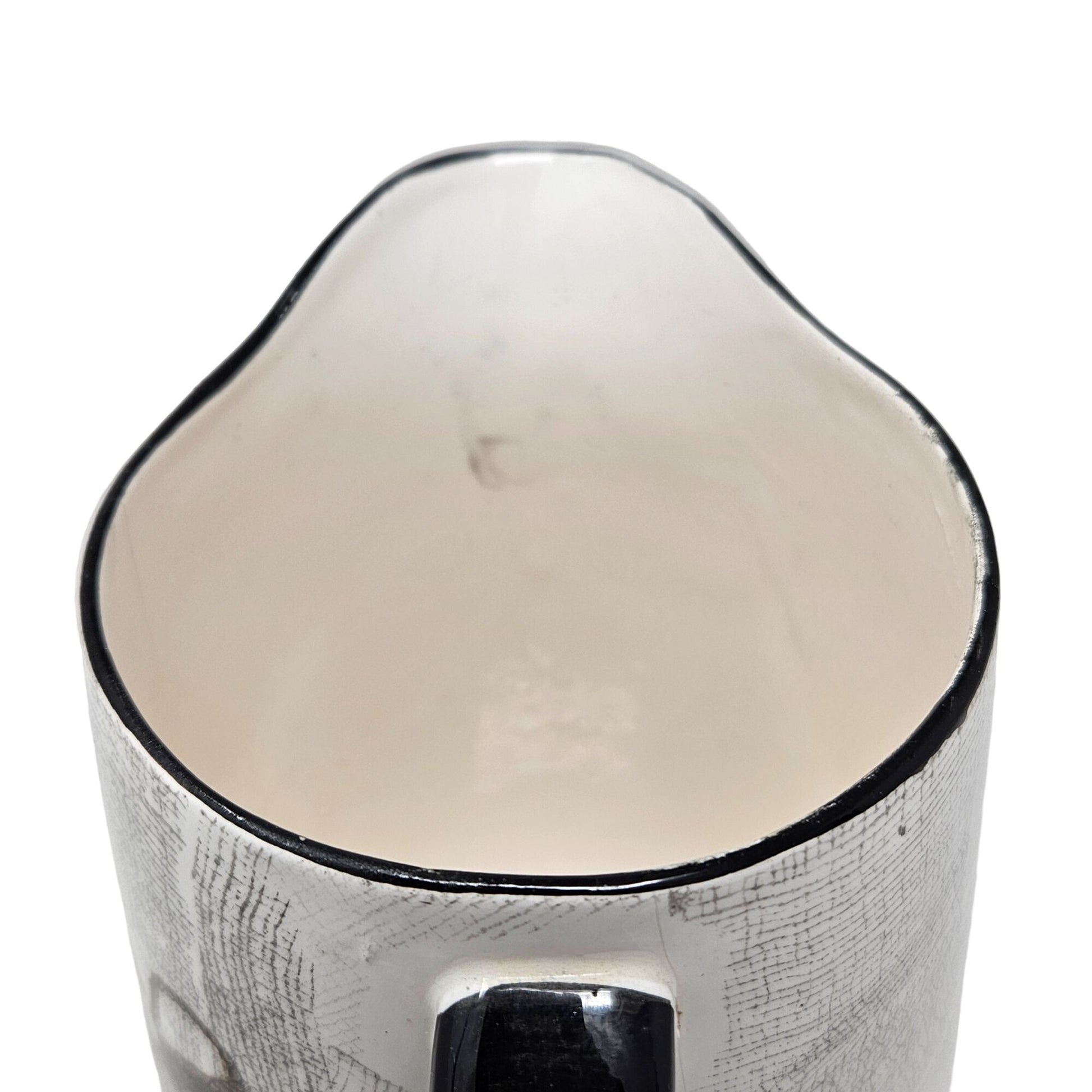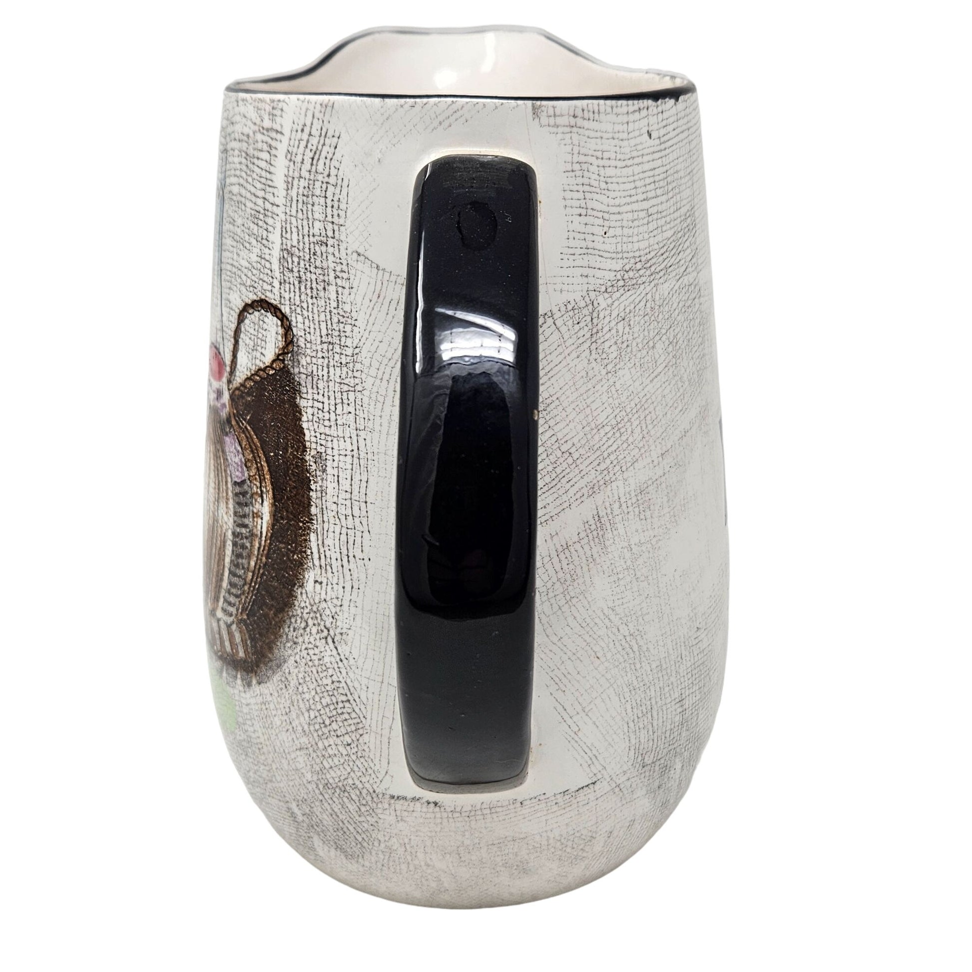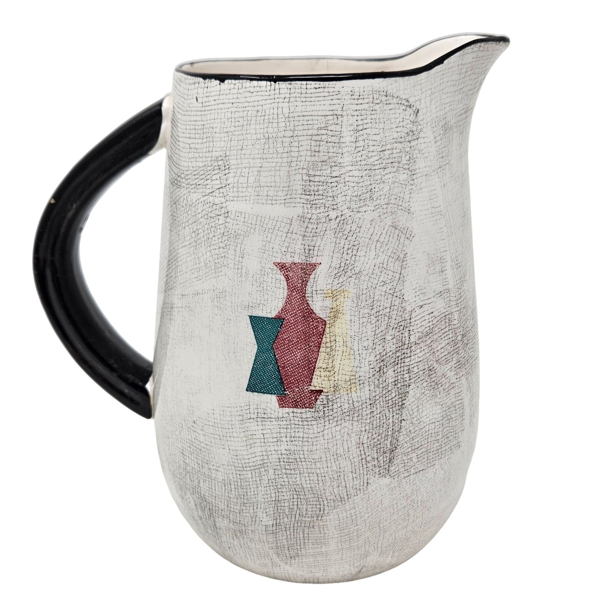 Mid-century inspired ceramic serving pitcher decorated with a wine bottle, cheese wedges and abstract motif in rich earthy tones—a striking vintage accent for your kitchen or home décor. Crafted in Japan with a crackled glaze finish and bold black handle, this piece brings retro charm and functional elegance to a bar cart or dining table. Pair it with jazz-era glassware or modern minimal pieces for a rewarding contrast. A standout item that blends collectible appeal with everyday design usage.