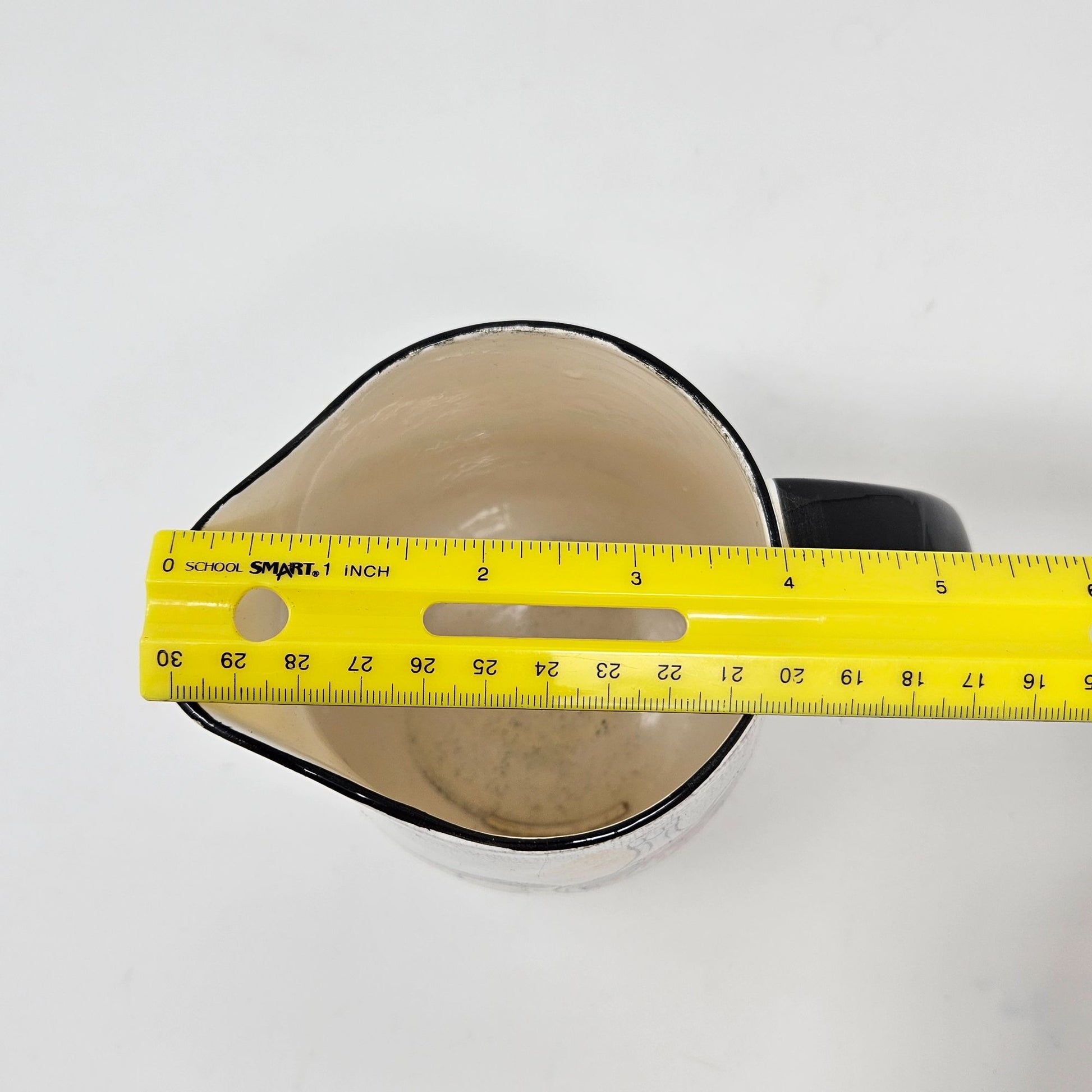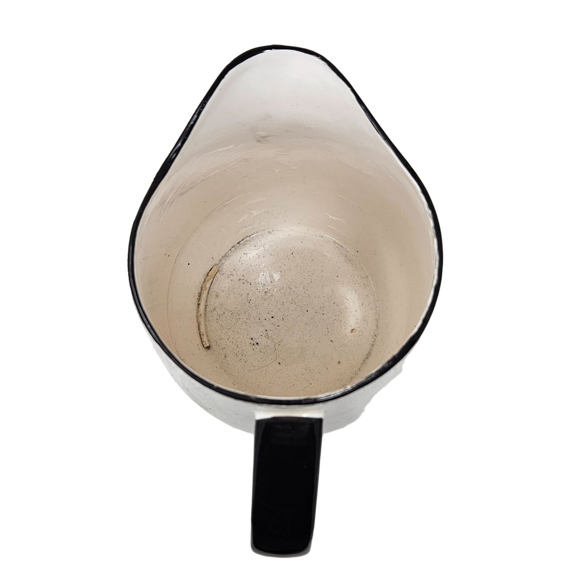 Chip in paint on handle and some wear on inside of pitcher. Please see pictures for an accurate description of the item and condition. Colors vary based on perception and screen display.