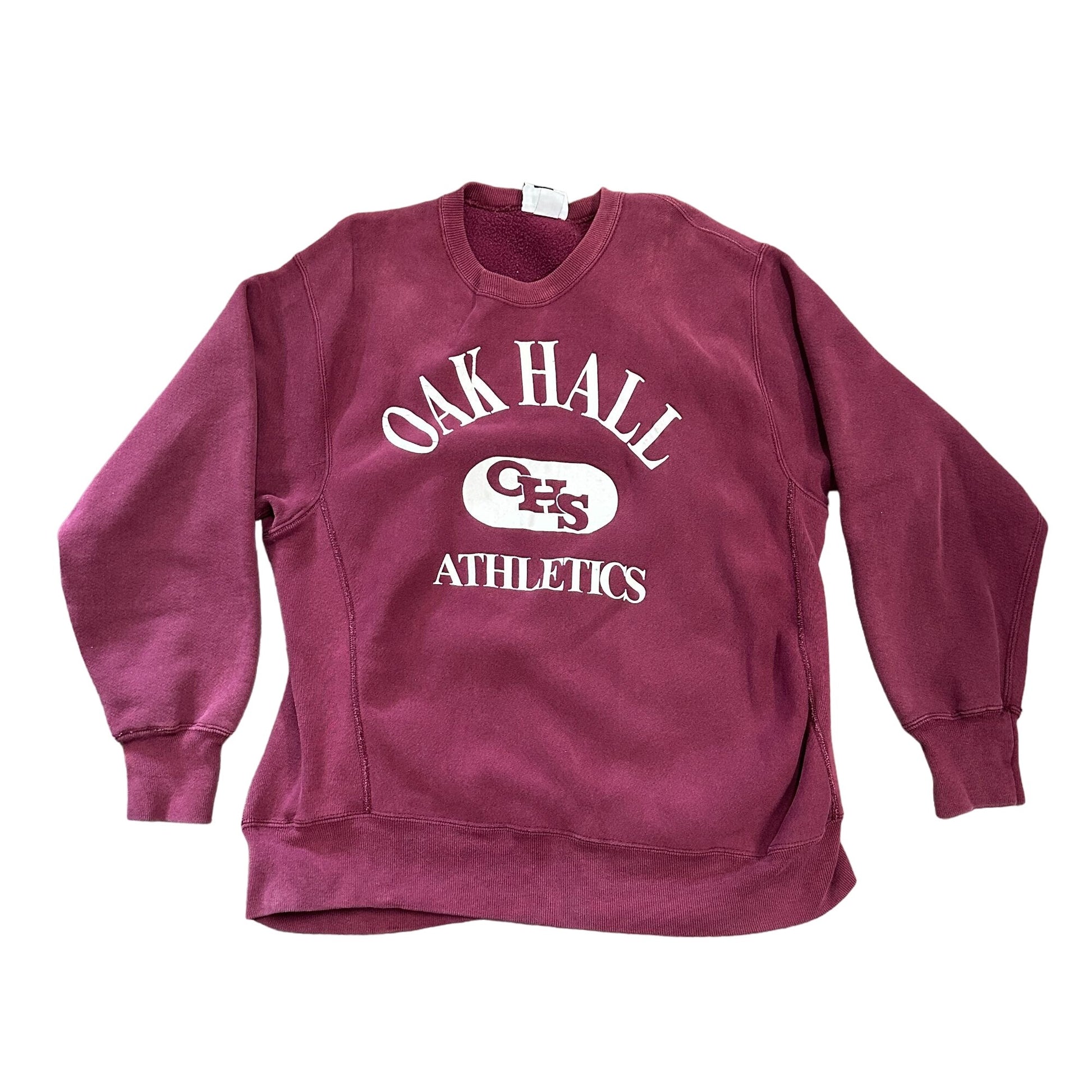 This rich burgundy heavyweight pullover features a bold “Oak Hall Athletics” graphic across the chest, making it a standout piece of retro sportswear with collegiate flair. Crafted in classic crewneck style, the comfortable cotton-blend fabric and crispside panel stitching add structural detail and vintage heft. Ideal for lovers of heritage athletic gear or those after that re-worked old-school prep aesthetic, it slides perfectly into a versatile wardrobe where comfort meets bold branding.