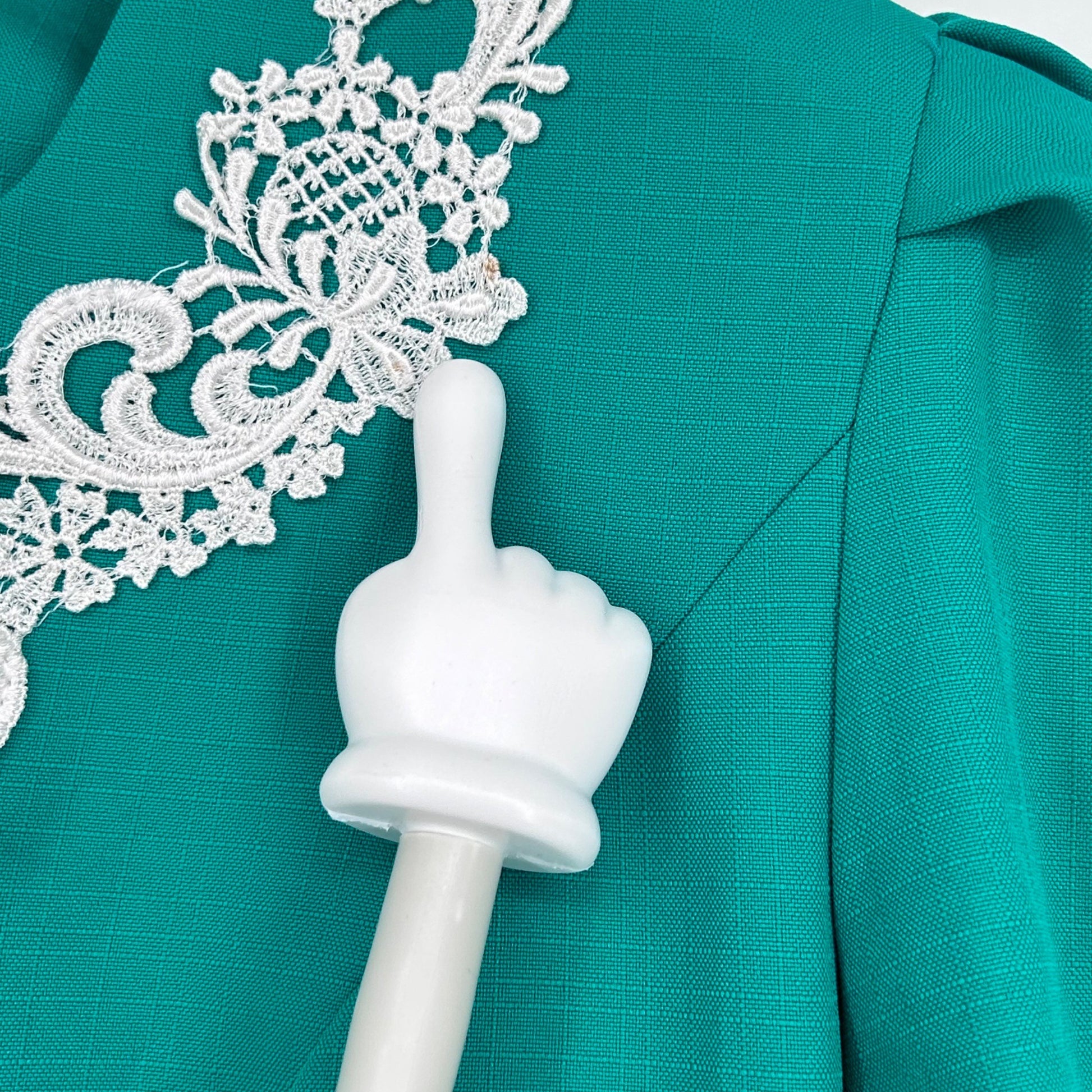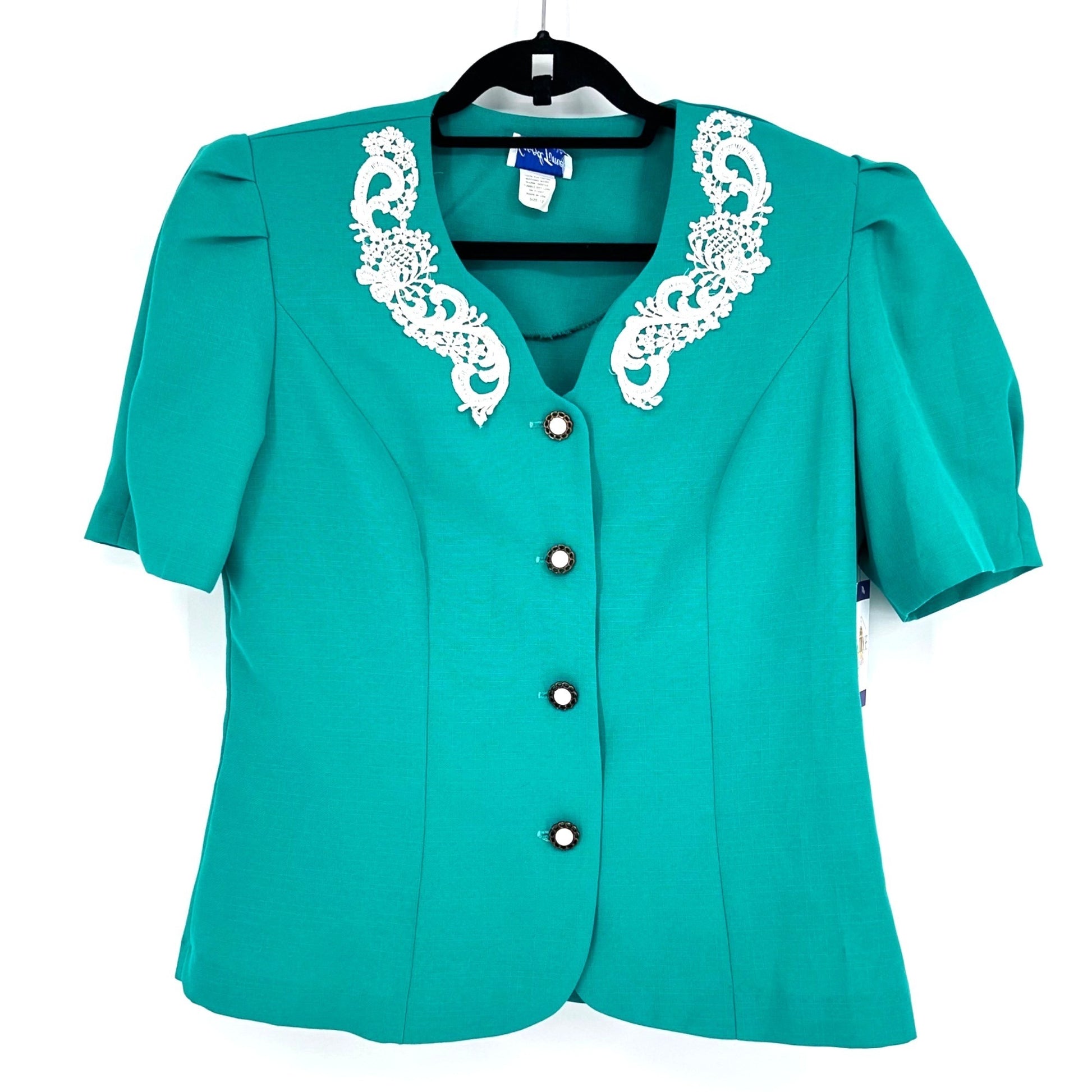 This vintage Good Times set offers a sophisticated look with intricate lace accents, providing a stylish option for professional or semi-formal occasions. Its two-piece design allows for versatile outfit combinations. Embrace the elegance and timeless appeal of this teal ensemble that aims to enhance your wardrobe.