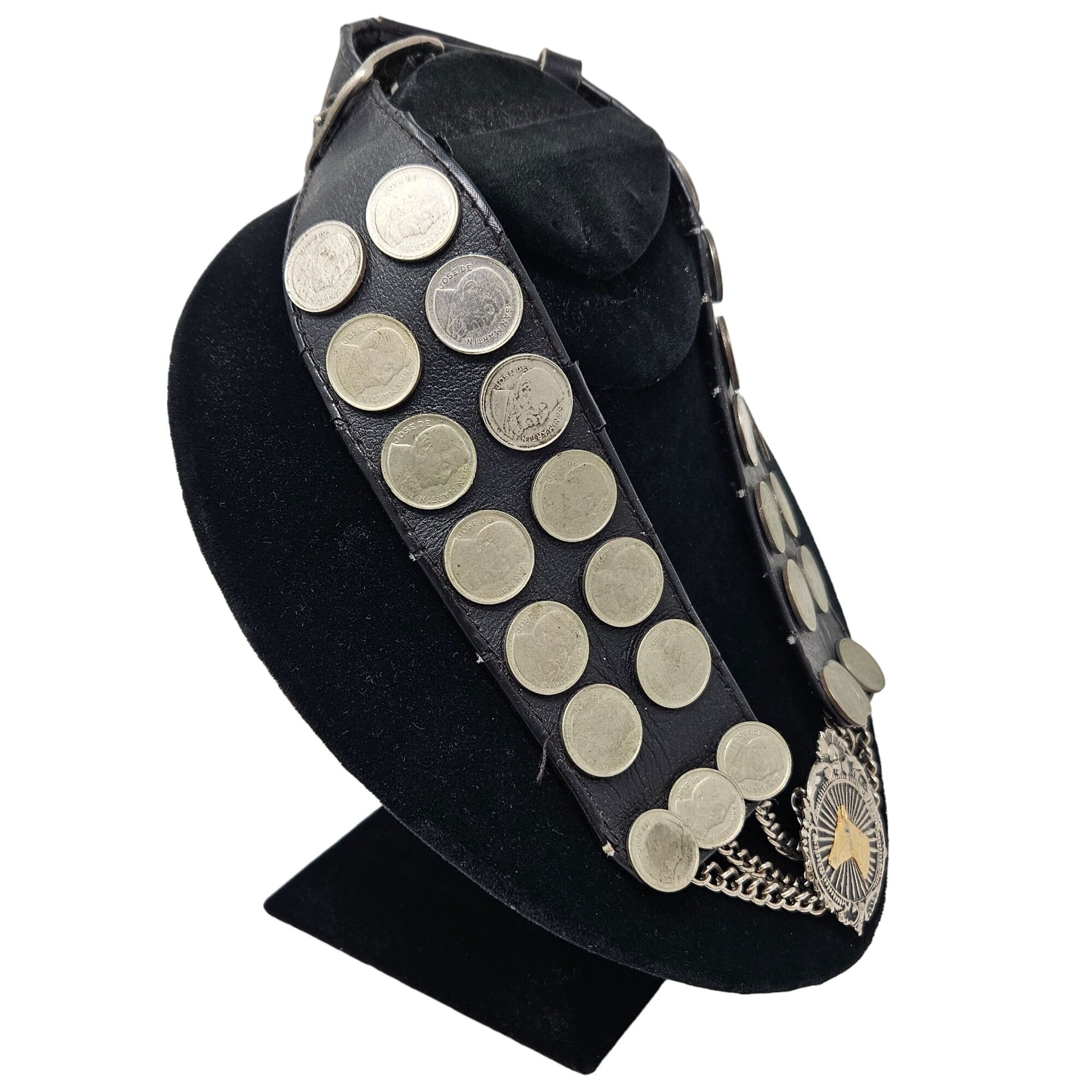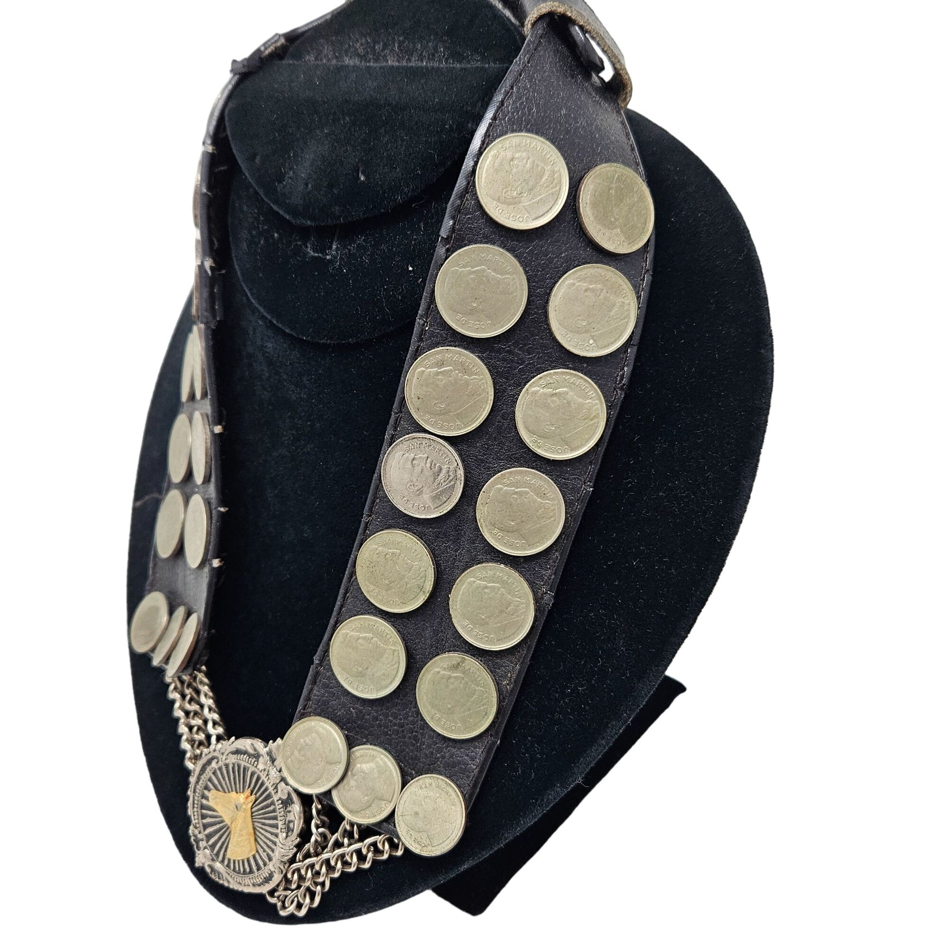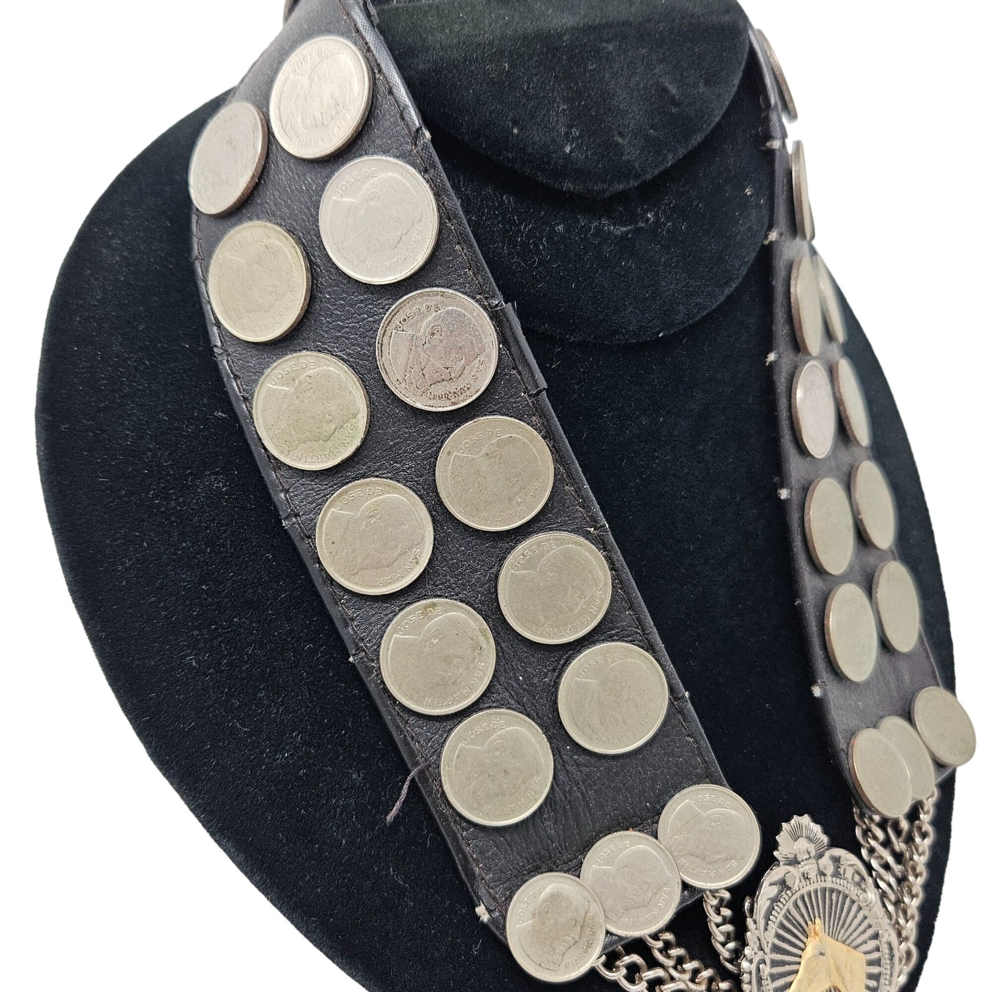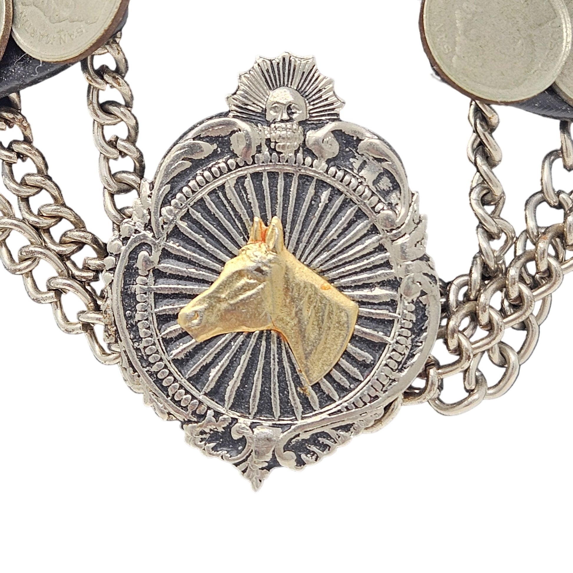Unique vintage Argentine coin collar necklace featuring genuine coins hand-riveted into black leather with a striking equestrian medallion centerpiece. Likely crafted by small artisans in Argentina, these collars were popular from the 1960s–1980s and showcase bold equestrian style with handcrafted detail. The design features layered silver-tone chains, a gold-tone horse head medallion, and a dramatic presence that makes this piece ideal for collectors, costume, or statement wear. Measuring approximately 26" in length, this rare handmade piece blends rustic charm with equestrian elegance.