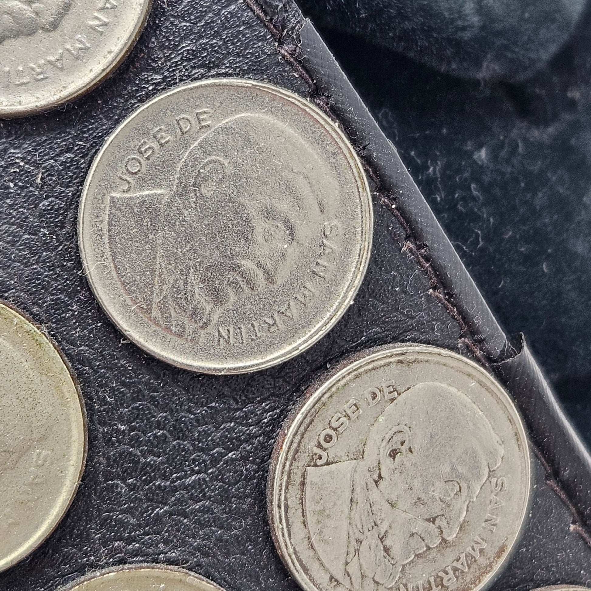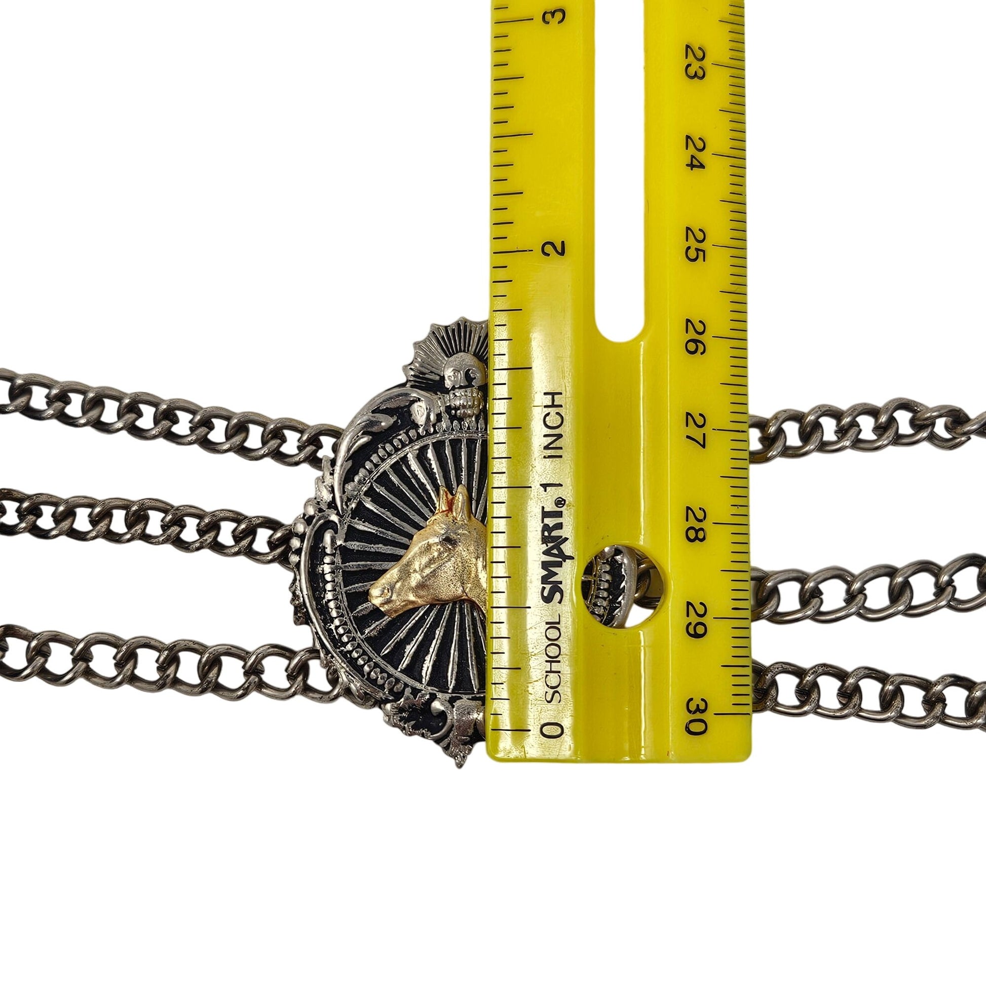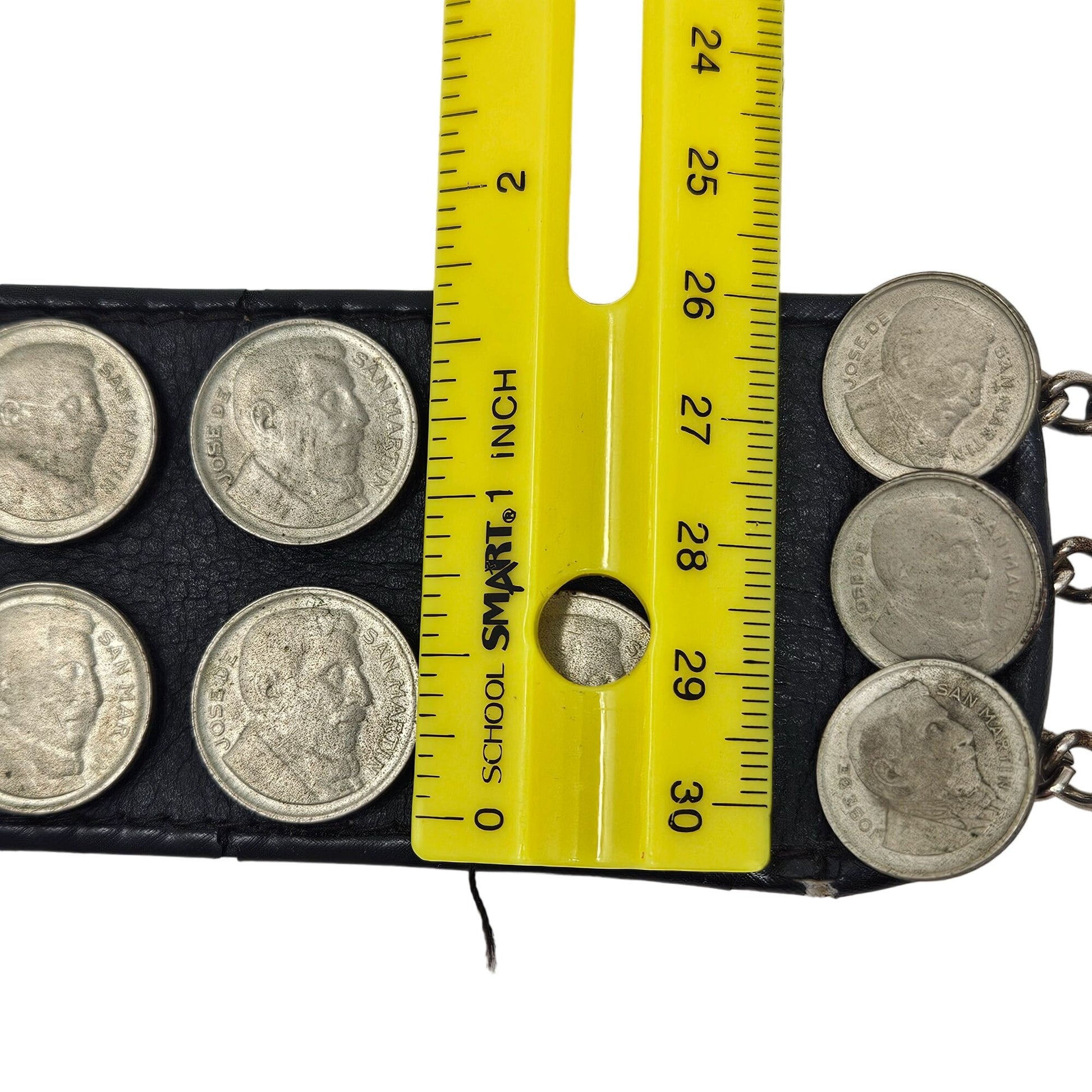 Unique vintage Argentine coin collar necklace featuring genuine coins hand-riveted into black leather with a striking equestrian medallion centerpiece. Likely crafted by small artisans in Argentina, these collars were popular from the 1960s–1980s and showcase bold equestrian style with handcrafted detail. The design features layered silver-tone chains, a gold-tone horse head medallion, and a dramatic presence that makes this piece ideal for collectors, costume, or statement wear. Measuring approximately 26" in length, this rare handmade piece blends rustic charm with equestrian elegance.