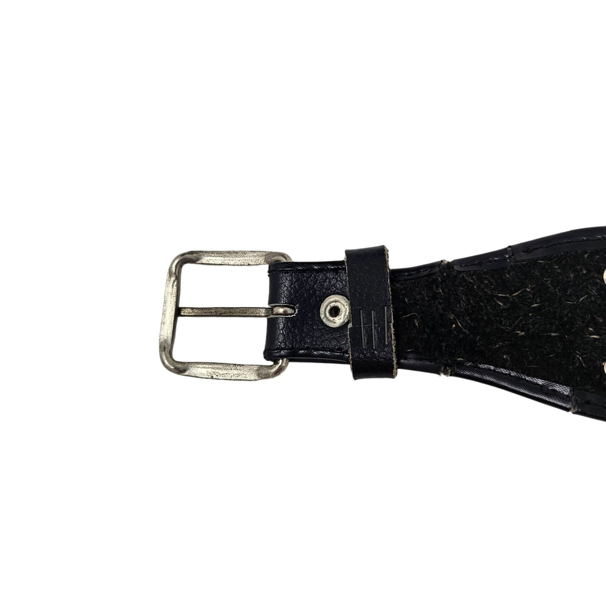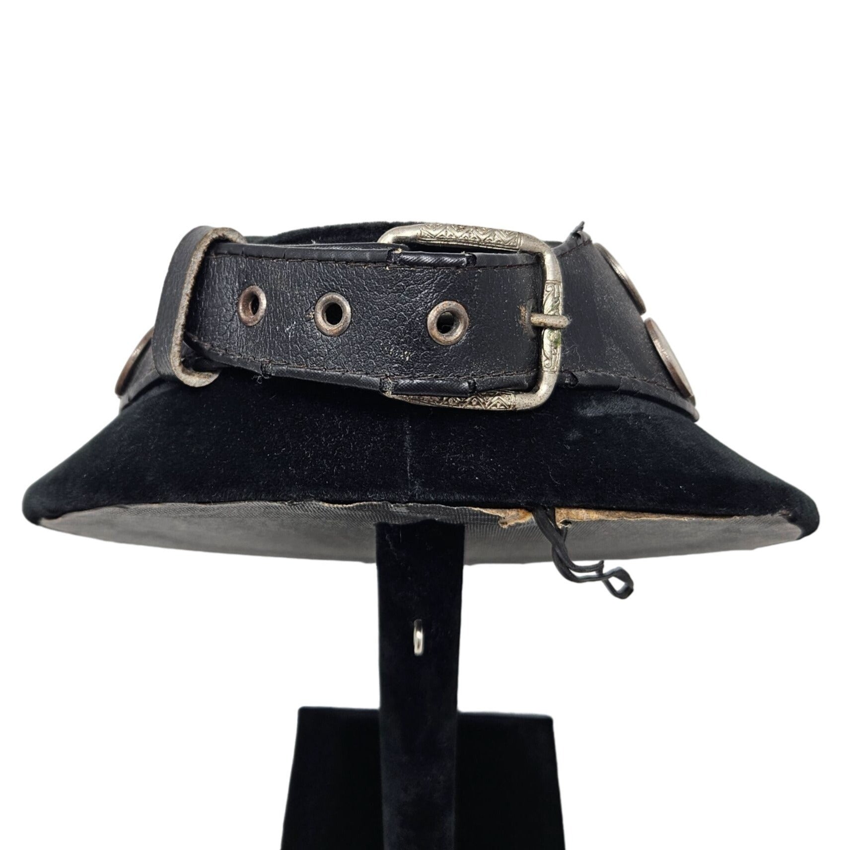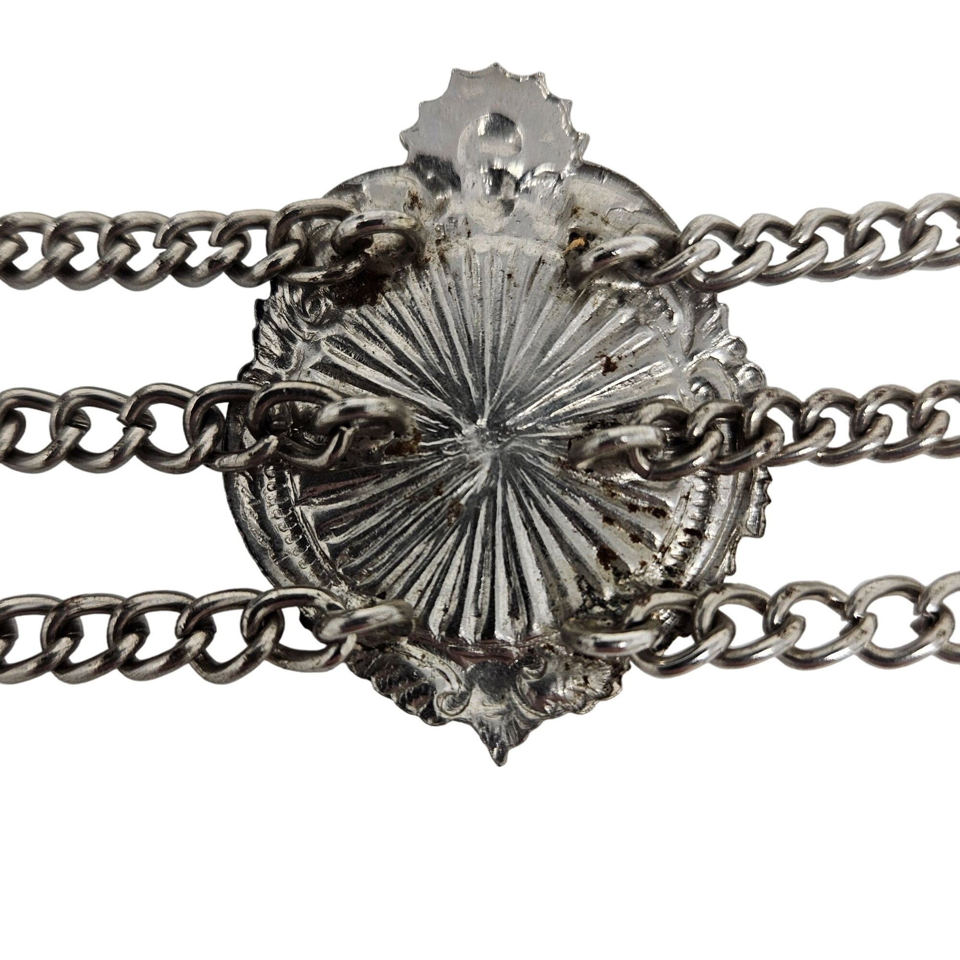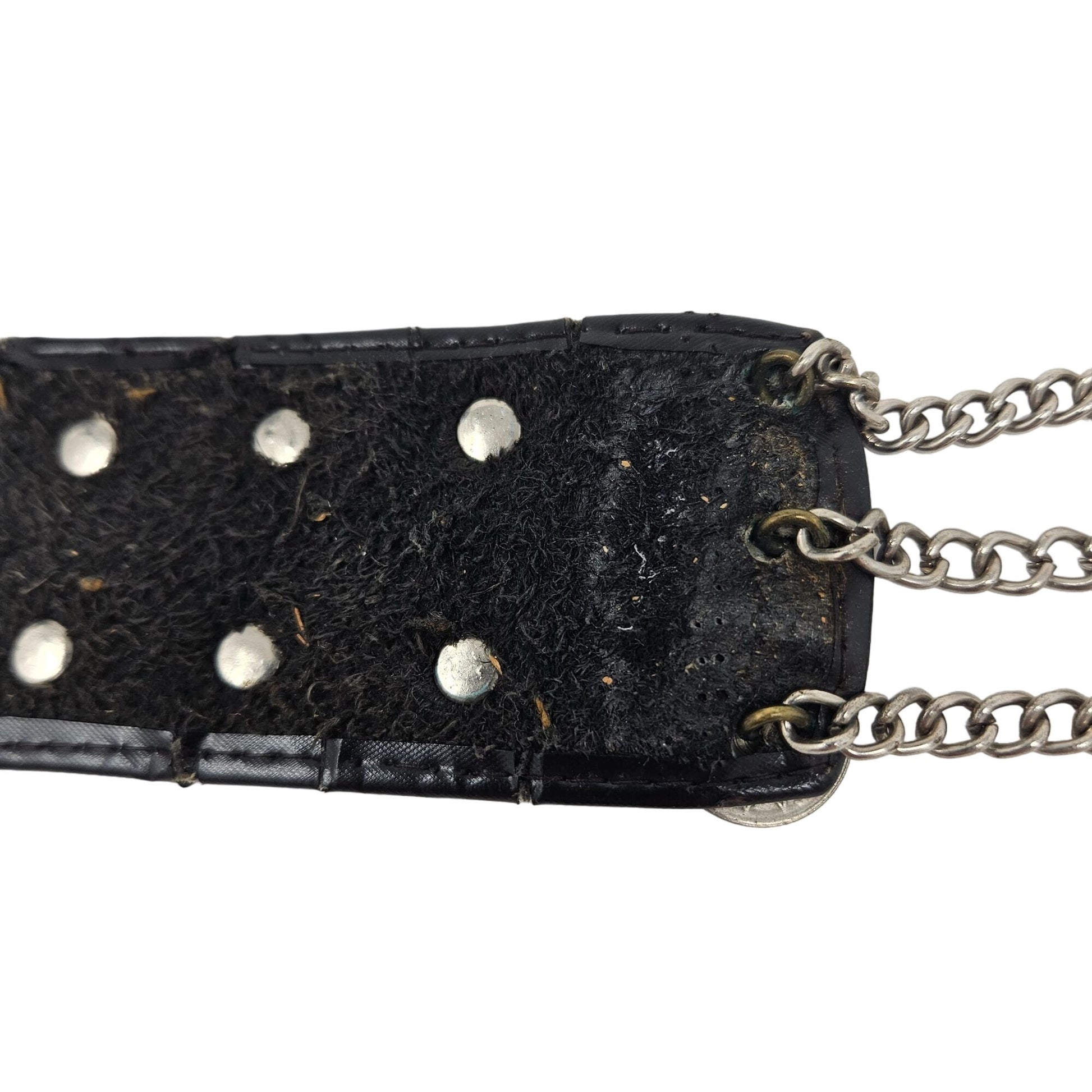 Unique vintage Argentine coin collar necklace featuring genuine coins hand-riveted into black leather with a striking equestrian medallion centerpiece. Likely crafted by small artisans in Argentina, these collars were popular from the 1960s–1980s and showcase bold equestrian style with handcrafted detail. The design features layered silver-tone chains, a gold-tone horse head medallion, and a dramatic presence that makes this piece ideal for collectors, costume, or statement wear. Measuring approximately 26" in length, this rare handmade piece blends rustic charm with equestrian elegance.