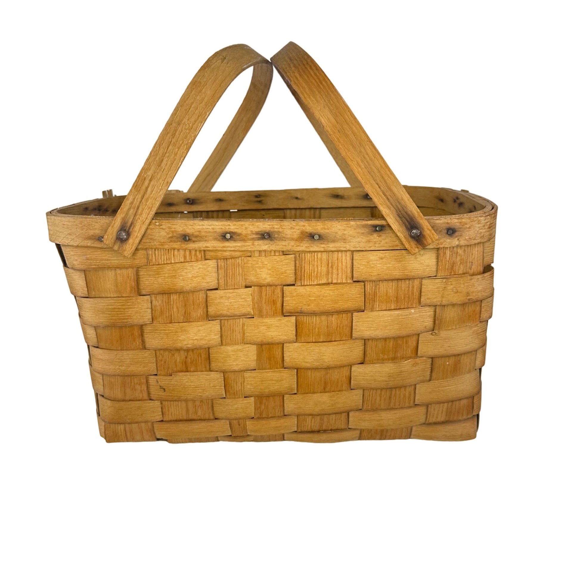 Vtg Basketville Woven Wood Picnic Basket Swing Handles Farmhouse Rustic Decor