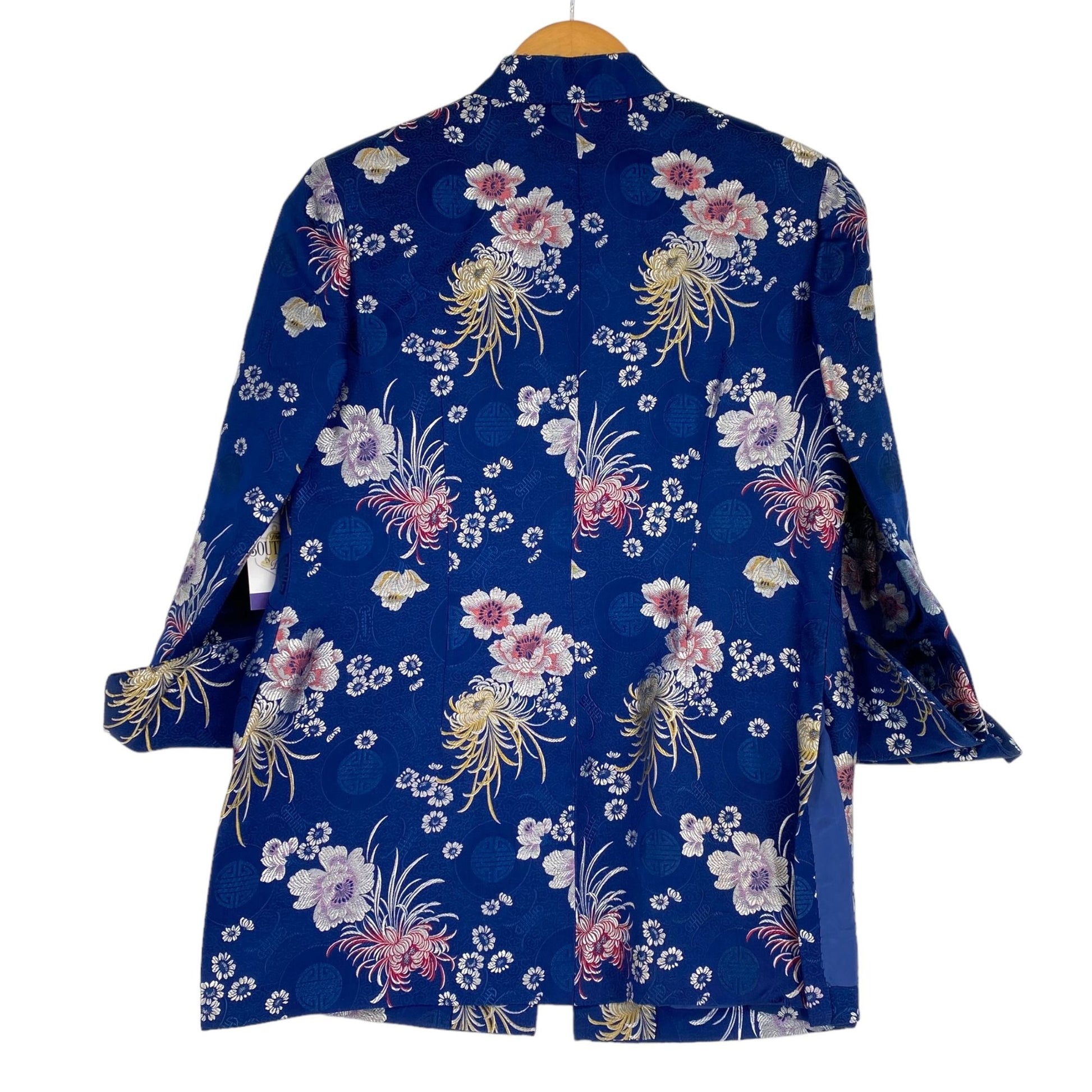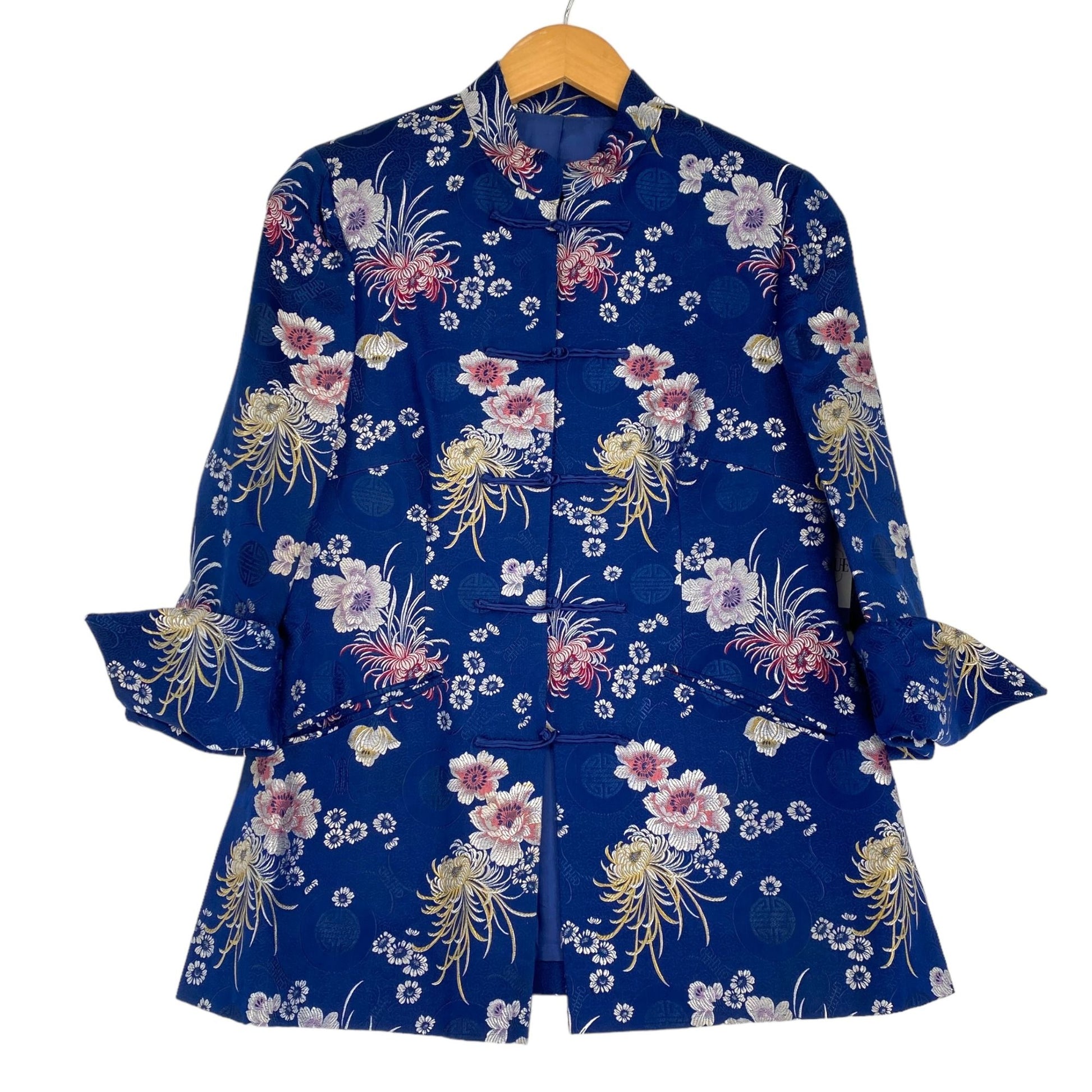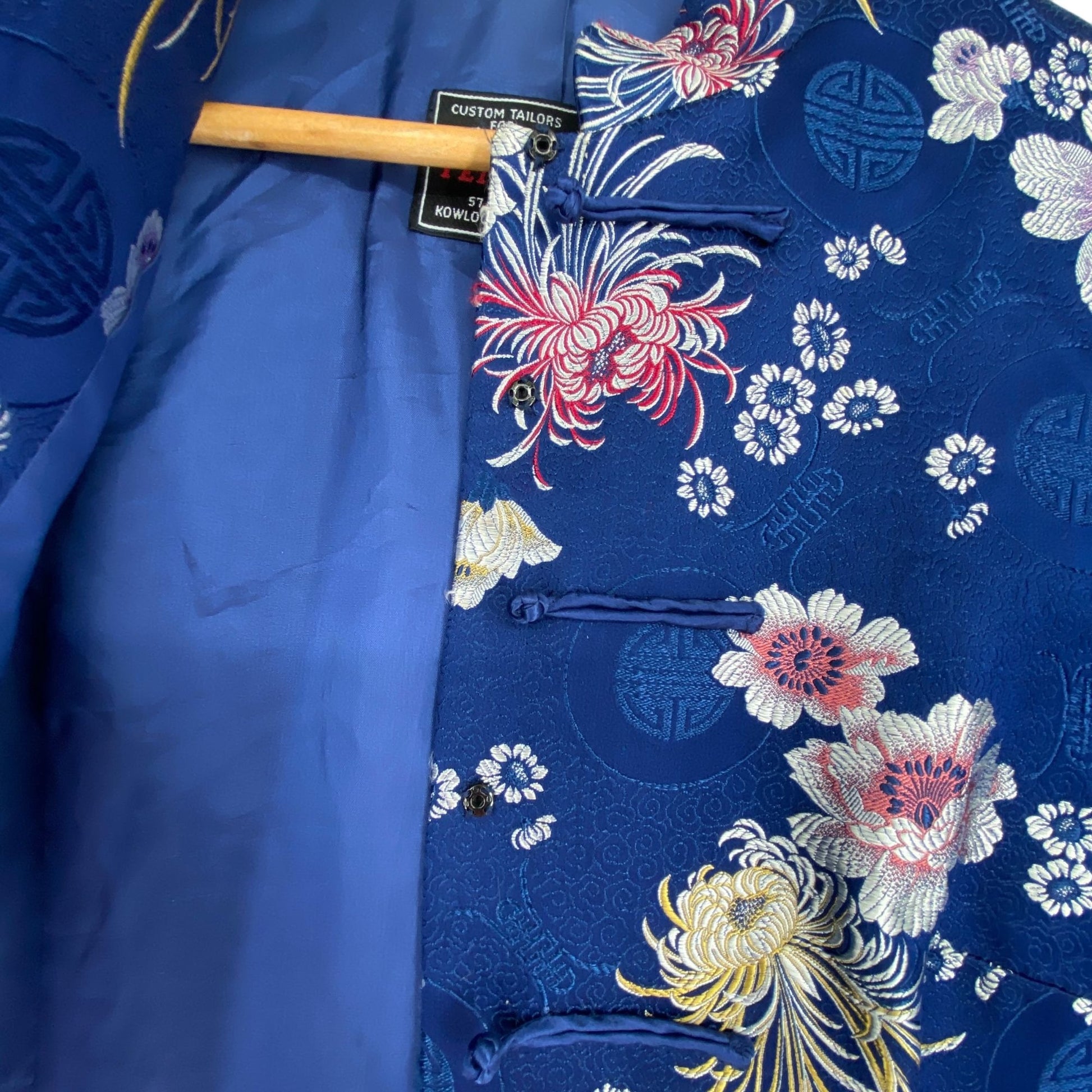 This vintage Pete’ Fashions jacket from Hong Kong captures timeless elegance with its striking blue floral brocade design and traditional Oriental styling. Featuring a mandarin collar, frog closures, and beautifully embroidered chrysanthemum and cherry blossom motifs, this jacket highlights exquisite craftsmanship with a luxurious satin lining and side pockets. Tailored by Pete’ Fashions of Kowloon, a well-known custom tailor shop, it offers a piece of Hong Kong tailoring history that blends Eastern tradition with versatile vintage fashion.