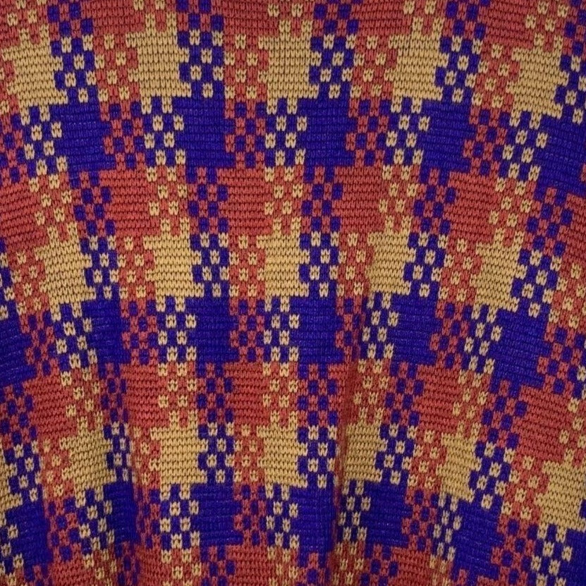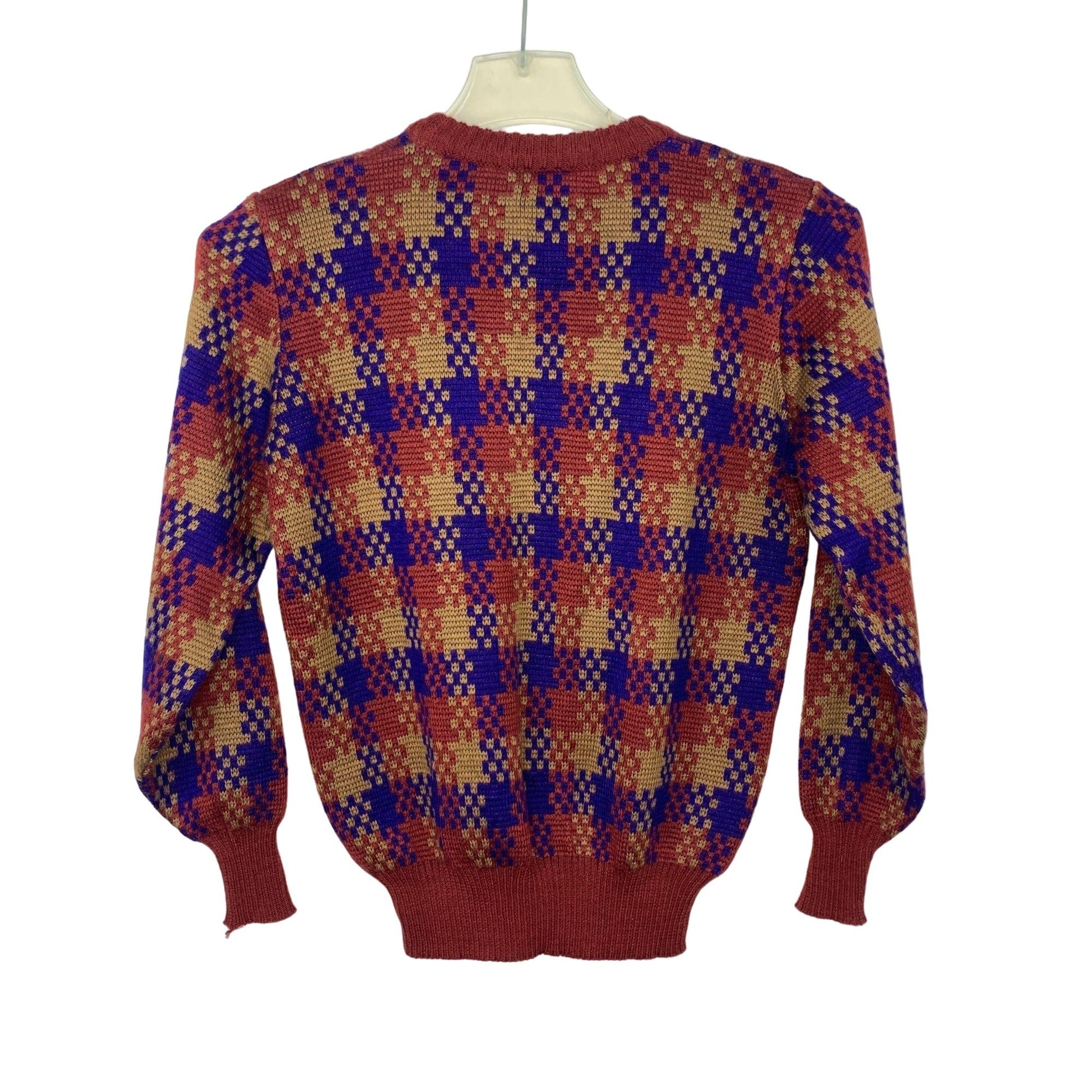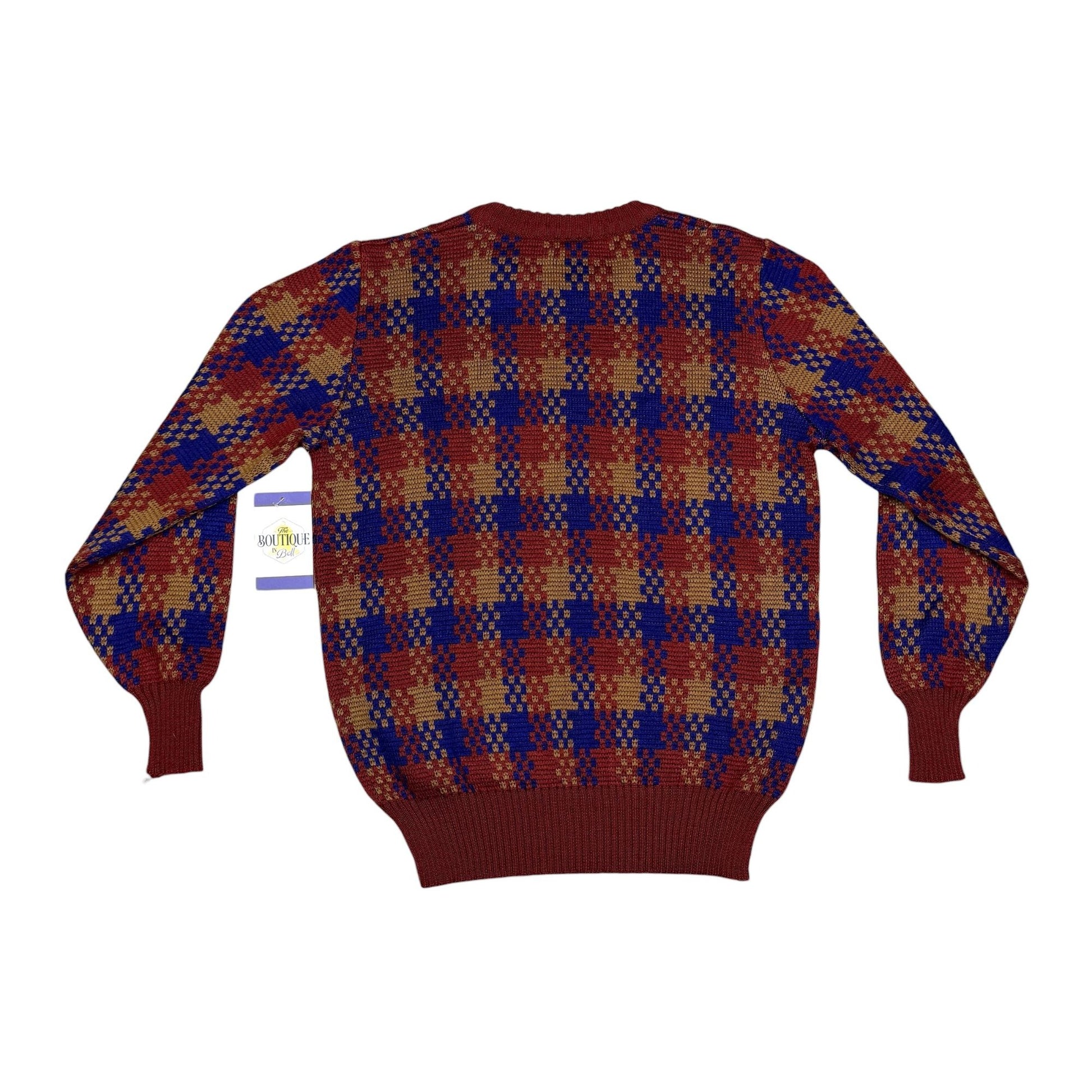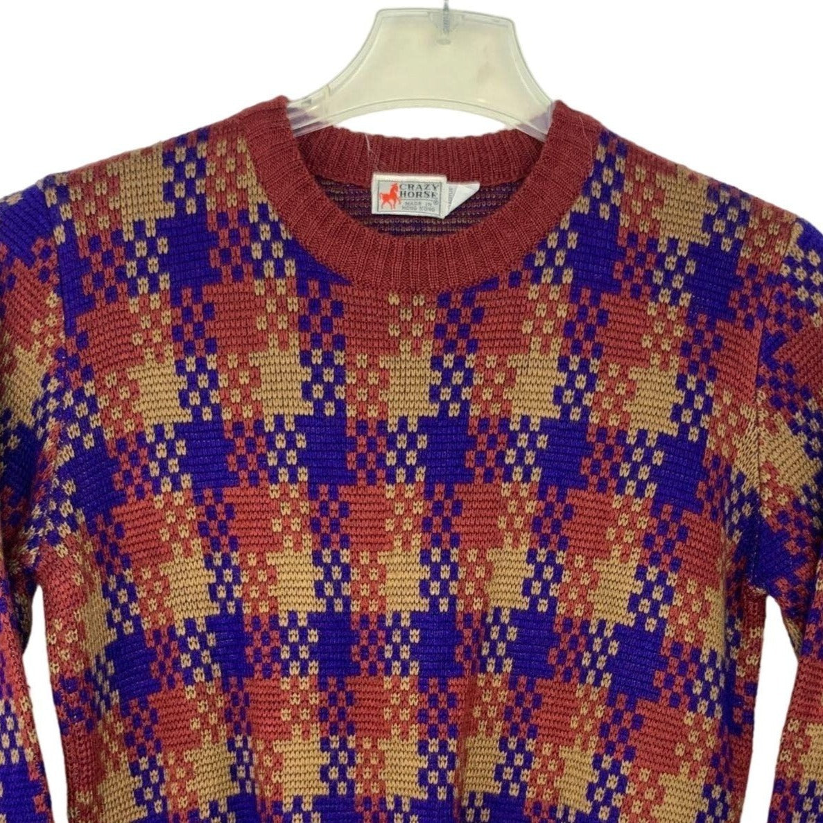 Vintage Crazy Horse medium pullover sweater featuring a unique plaid checkered pattern in rust, tan, and blue tones. This classic knit sweater has a round neckline, long sleeves, and ribbed cuffs and hem for a comfortable fit. Made in Hong Kong, this retro piece is perfect for layering in the fall and winter seasons.