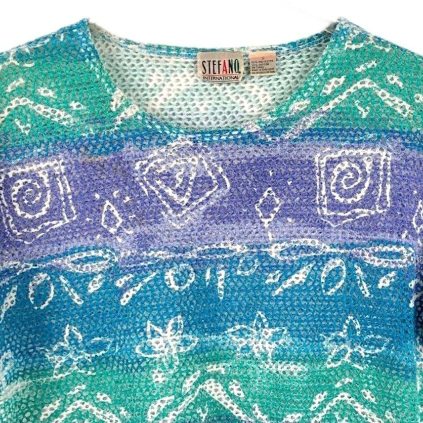 Vintage Stefano International women's short sleeve swim top in size S, featuring a vibrant green, blue, and purple geometric abstract print. Made of a lightweight, breathable mesh fabric, this see-through top is perfect as a beach cover-up, festival piece, or retro streetwear look. A bold and unique 90s/Y2K statement piece, ideal for summer, vacations, or layering over swimwear. Eye-catching and artsy, this top adds a fun, vintage vibe to any wardrobe! Made in Hong Kong.