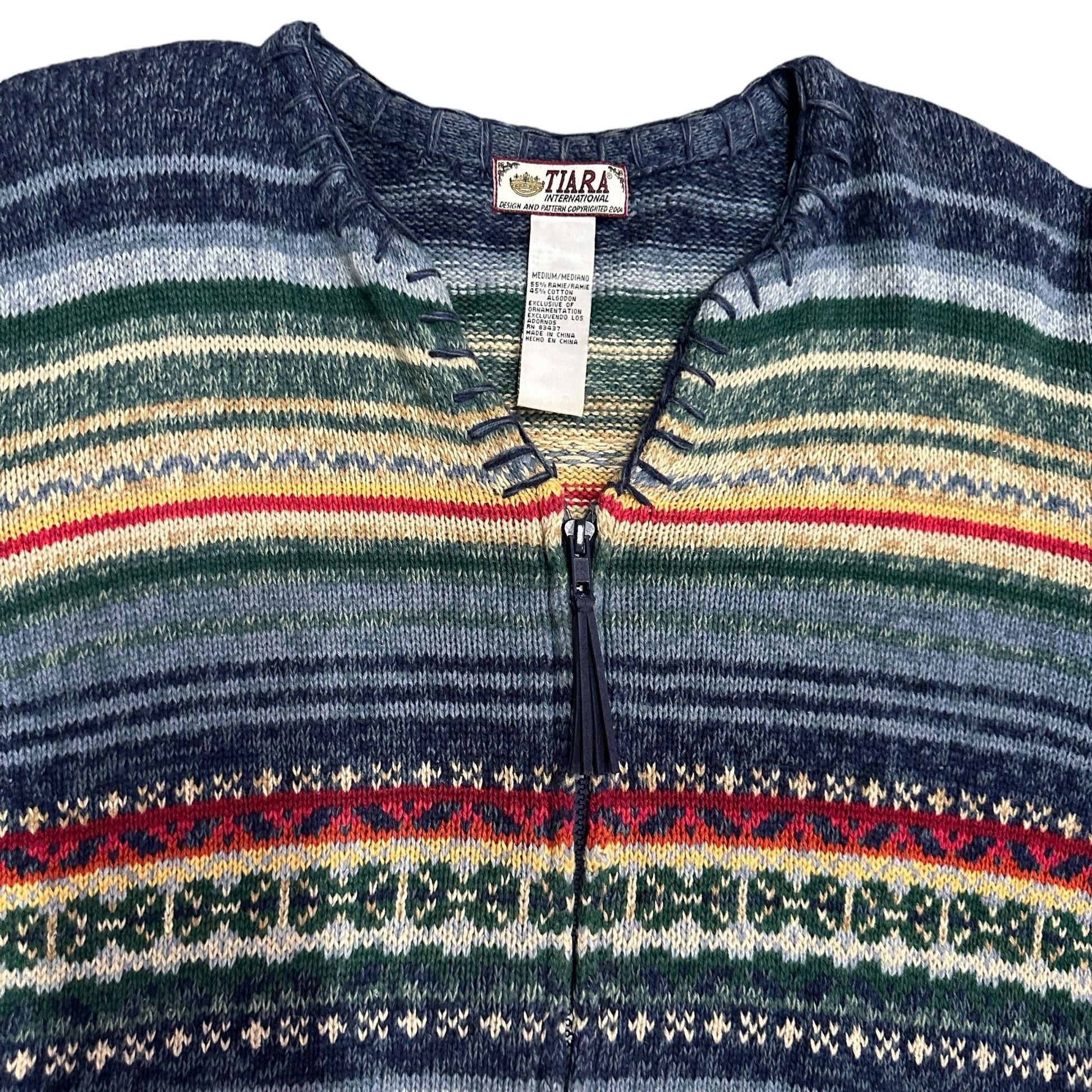 Step into timeless style with this vintage Tiara cardigan, showcasing a vibrant Fair Isle pattern. Its zip closure ensures easy wear, making it a versatile addition to any wardrobe. Crafted from quality materials, it promises warmth and durability, perfect for those seeking both fashion and functionality.