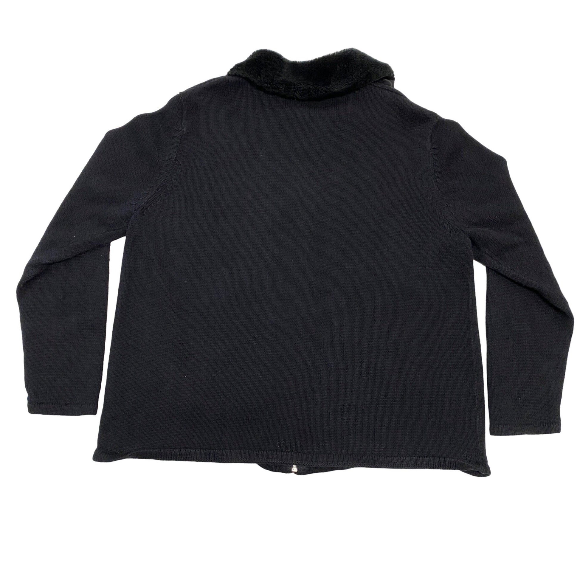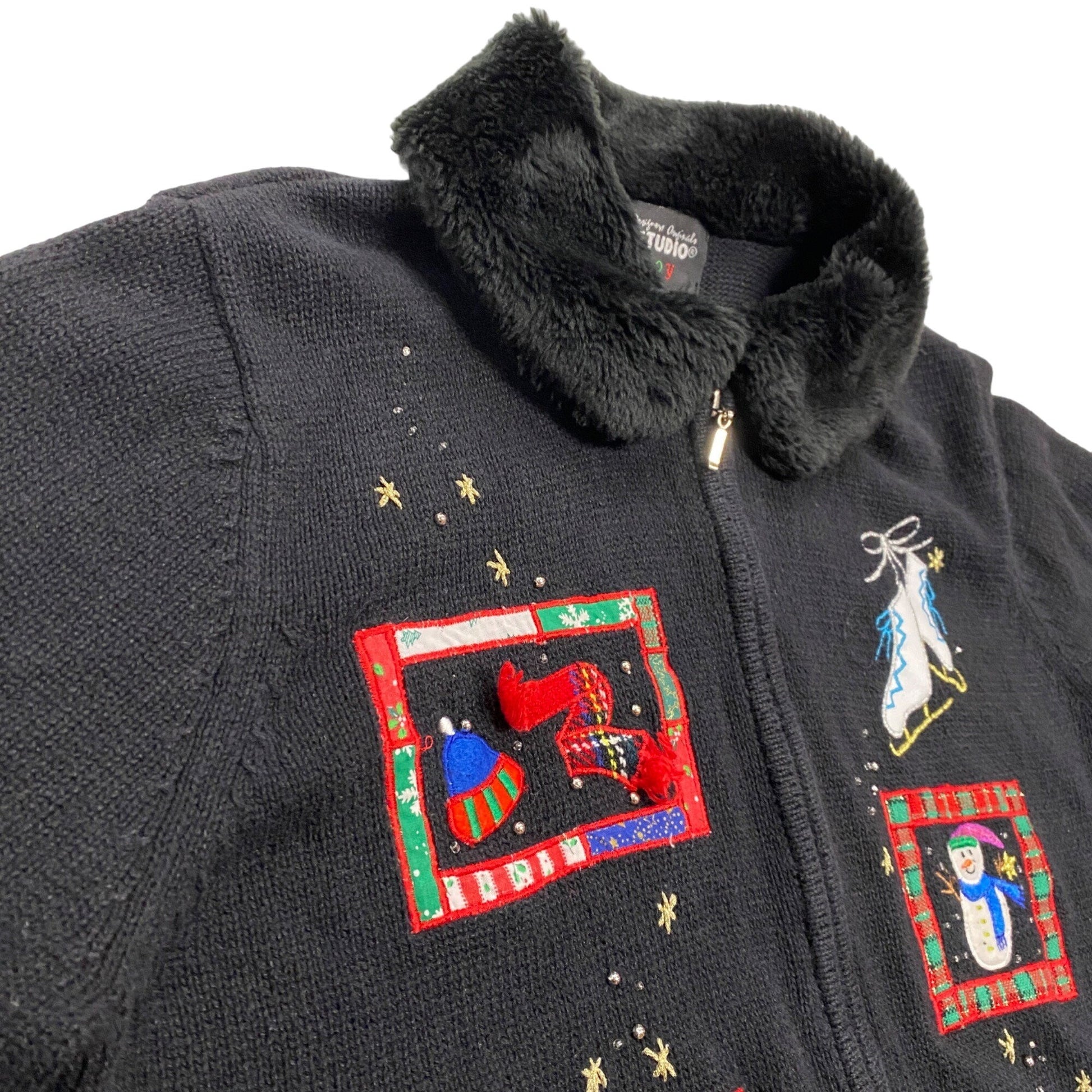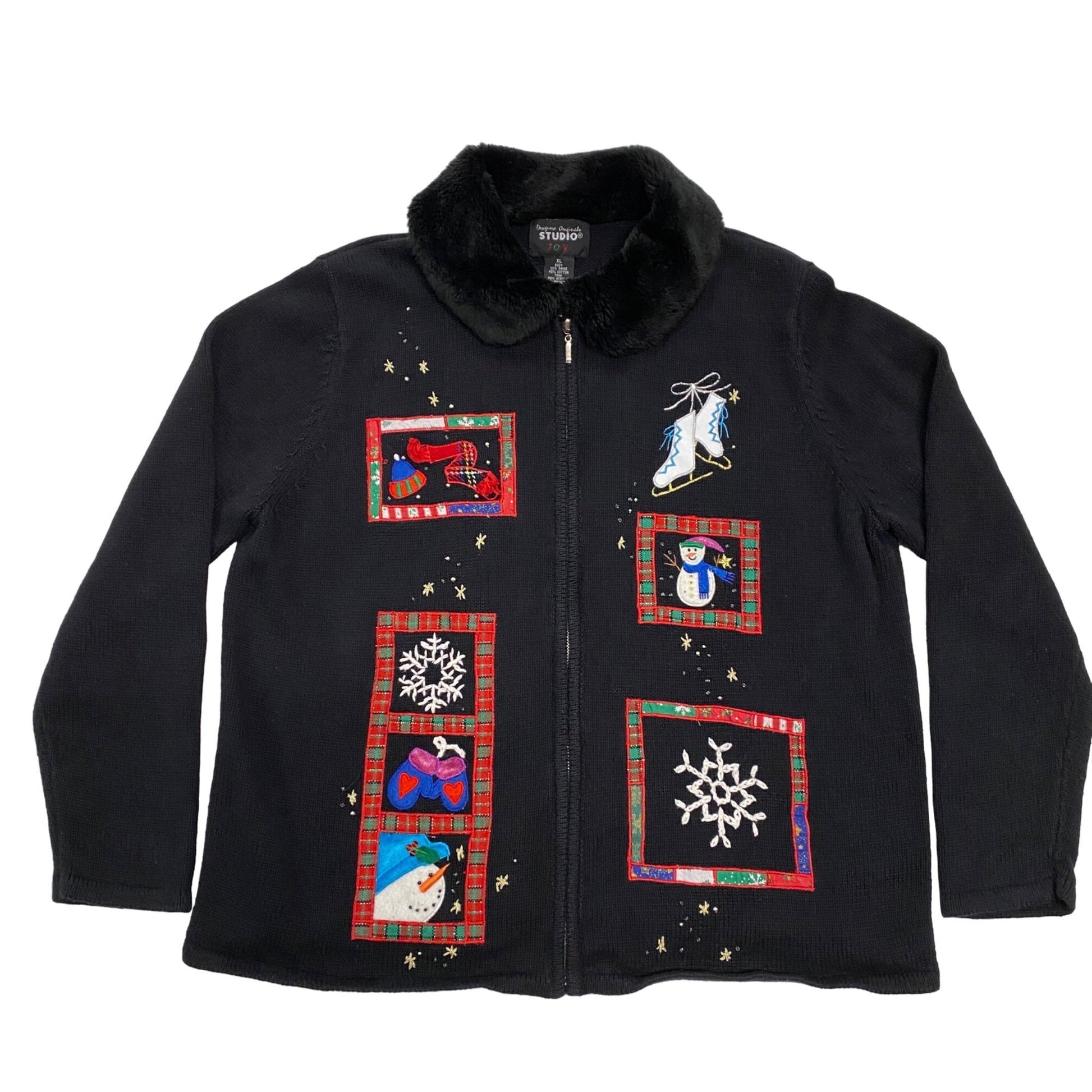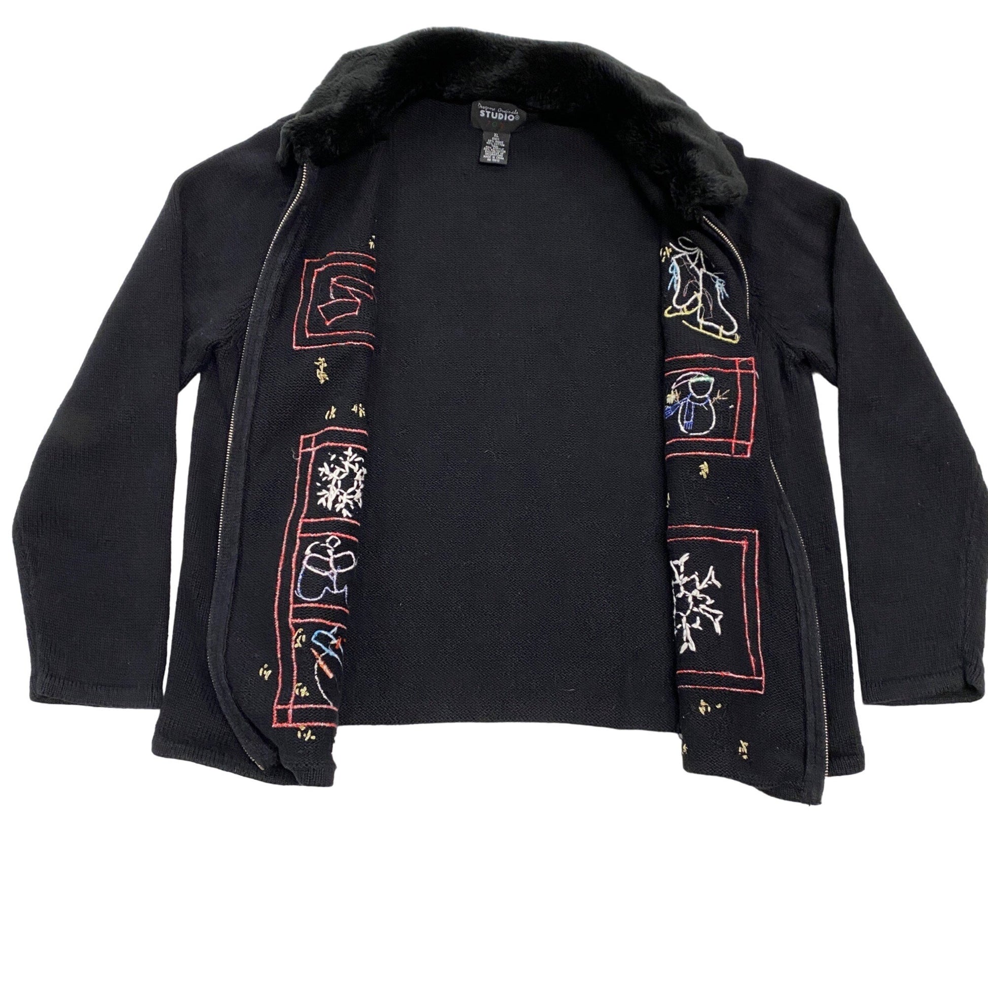 Vintage Designer Originals Studio black Christmas cardigan sweater featuring colorful patchwork embroidery and a plush faux fur collar. Accented with festive motifs like snowflakes, ice skates, and snowmen, this XL zip-up holiday sweater offers cozy comfort with nostalgic charm. Made from a soft cotton-ramie blend with acrylic/polyester trim, it's the perfect blend of warmth and whimsy for your next ugly sweater party or holiday gathering.