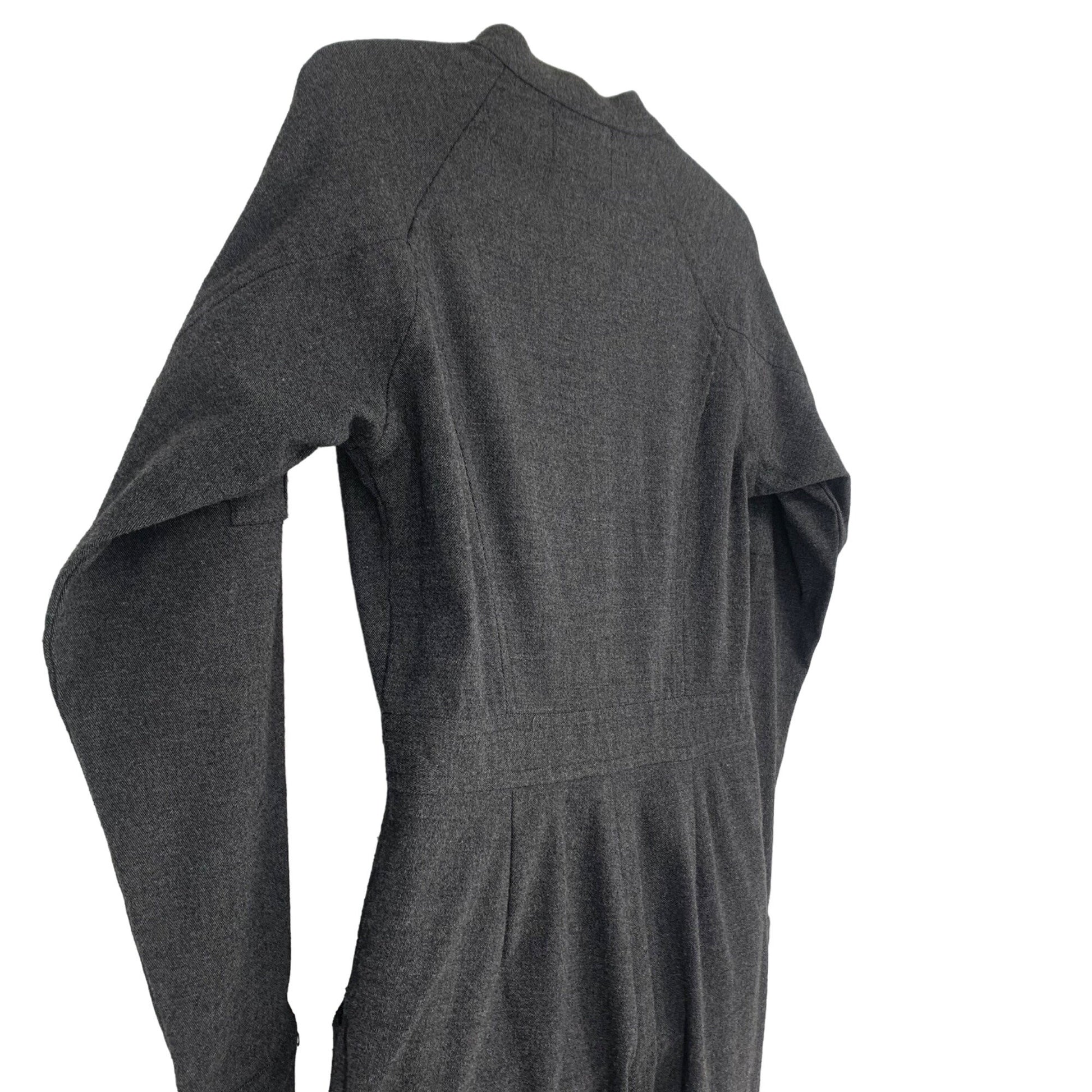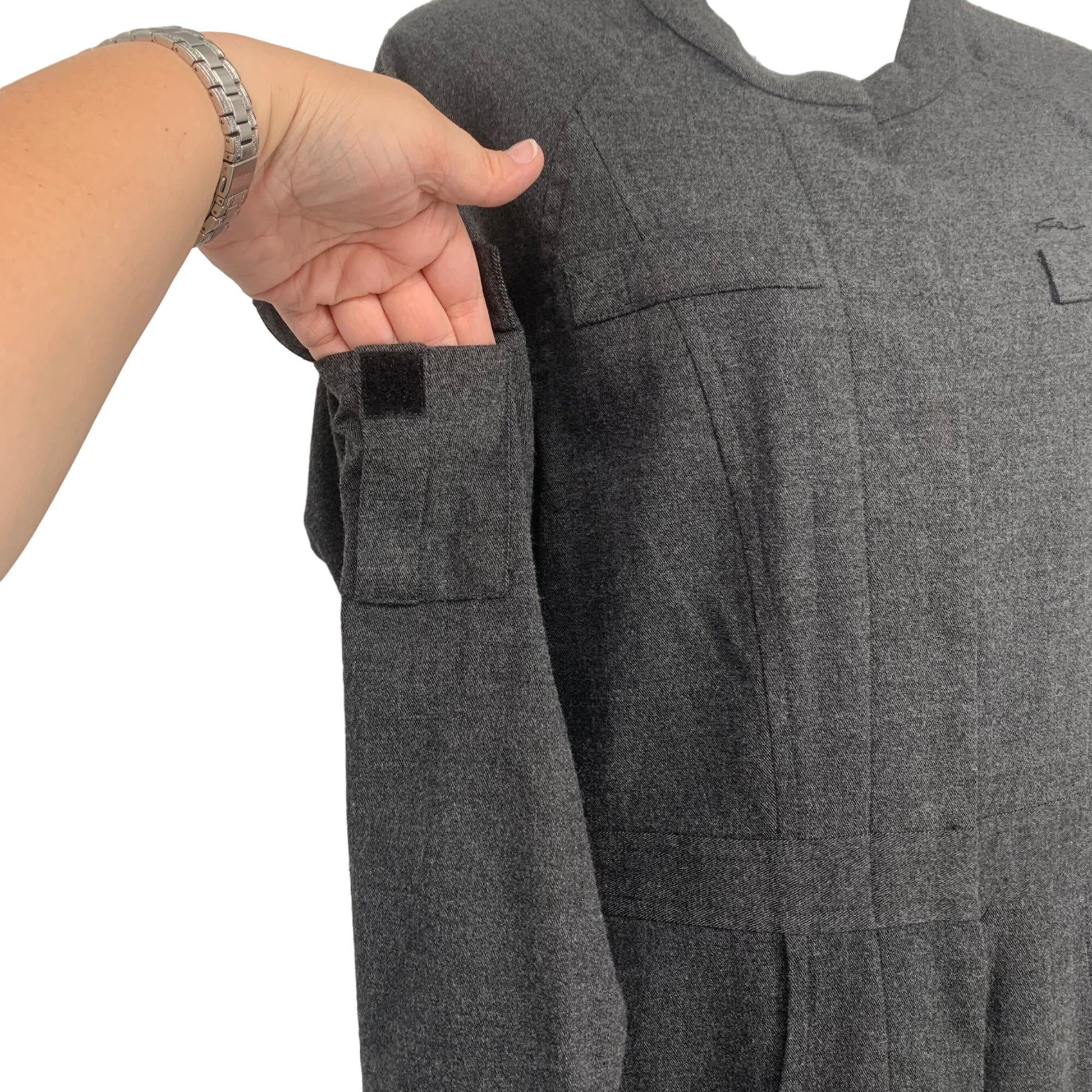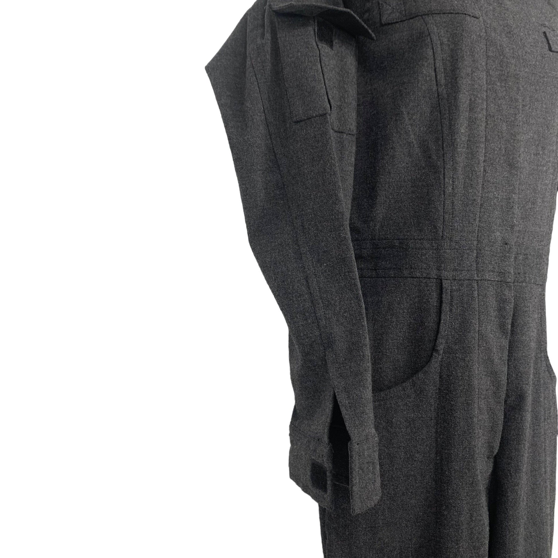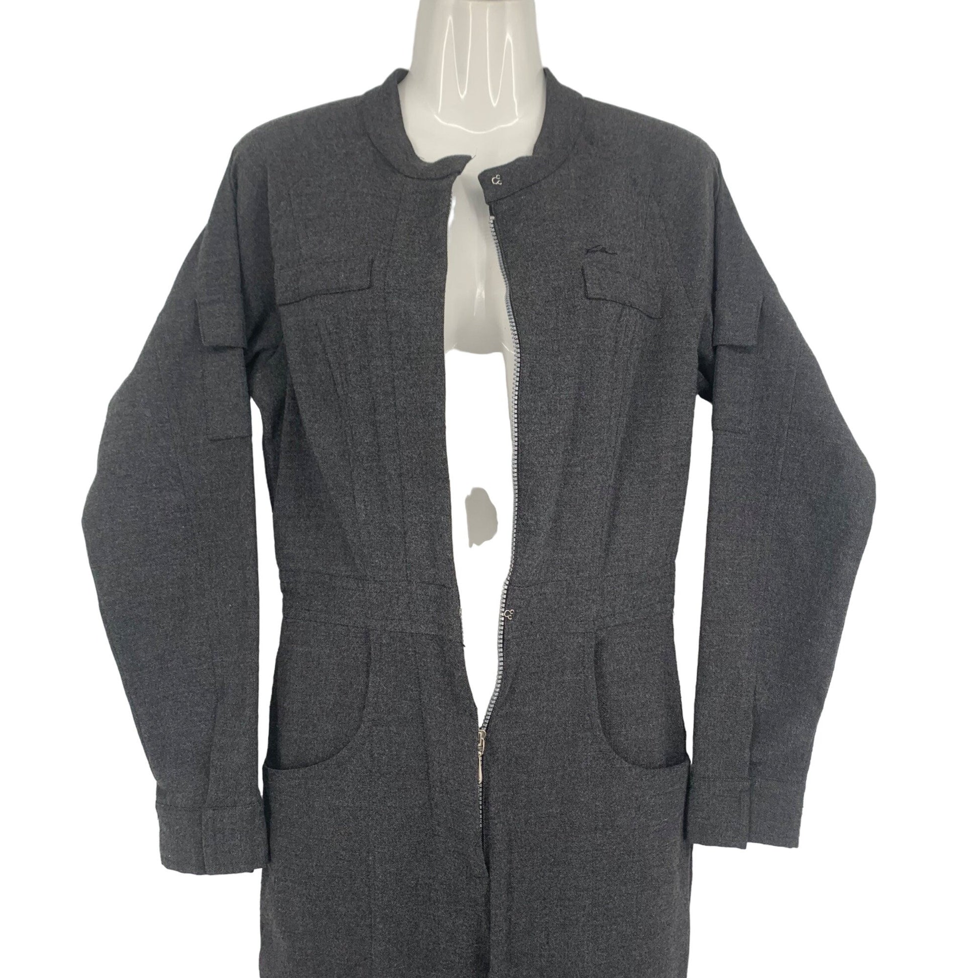 Step into sleek Y2K utility fashion with this vintage gray jumpsuit from the FUBU Platinum Series. Crafted with a soft yet structured polyester-rayon-spandex blend, this long-sleeve piece features a full front zipper with top hook closure, front flap and patch pockets, cargo-style sleeve pockets, and additional zippers at the hem for adjustable styling. Designed for movement and comfort with stretch fabric and a tailored silhouette, this jumpsuit blends streetwear with elevated workwear vibes. Made in Hong Kong, size large, and ideal for a curated 90s/Y2K wardrobe or modern minimalist closet.